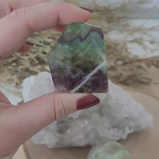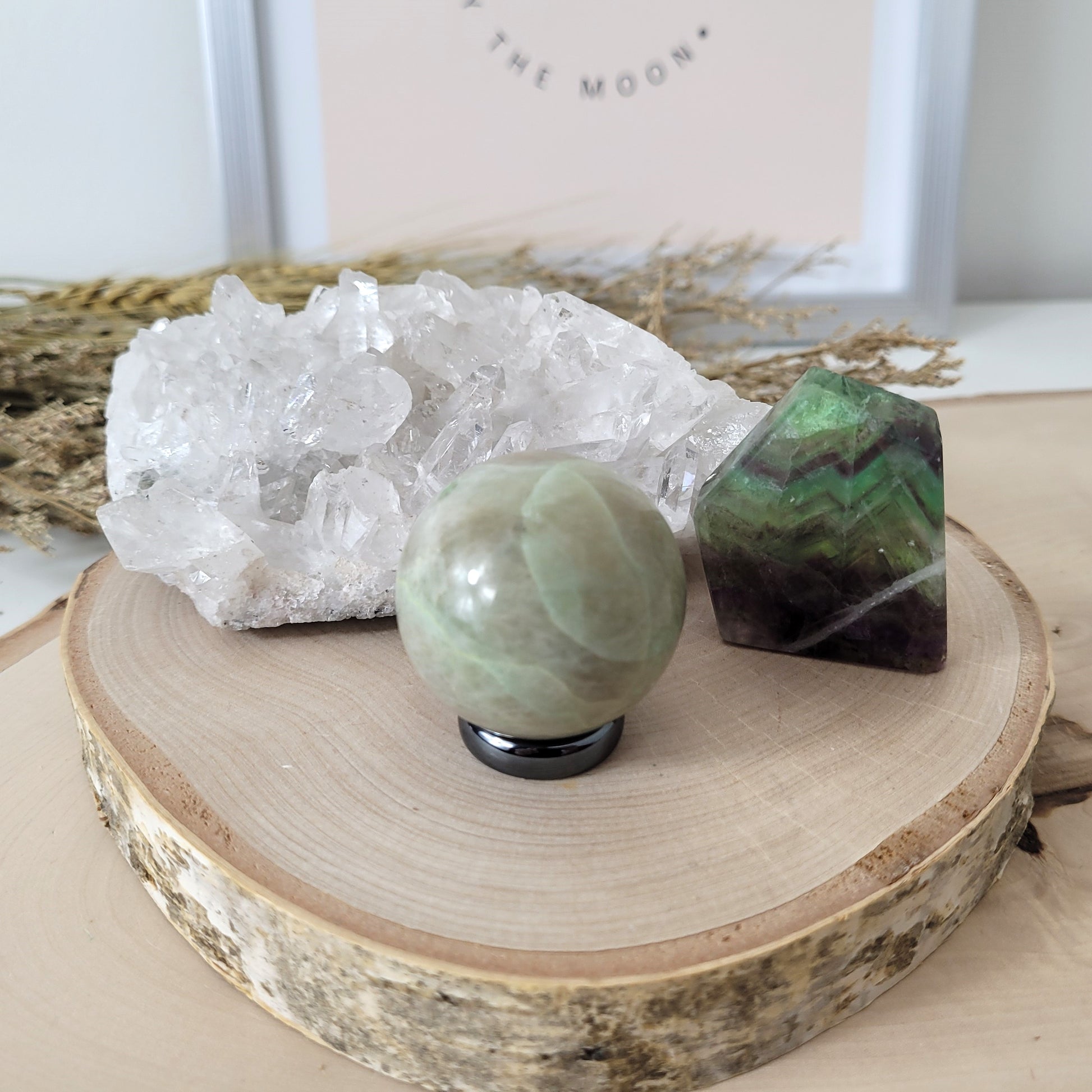 Angebot des Tages 23.02.2026 Set bestehend aus: Bergkristallstufe, Grüner Mondstein Kugel, Fluorit Scheibe Freiform