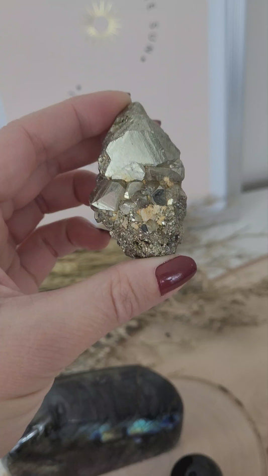 Bundle Angebot des Tages 07.12.25, Labradorit Freiform, Larvikit Kugel inklusive Kugelständer, Pyrit Kristallstufe