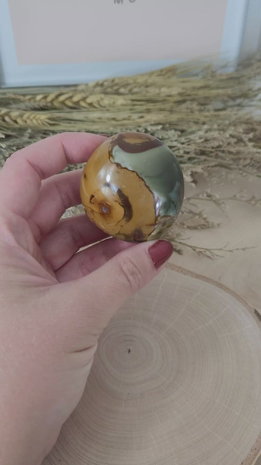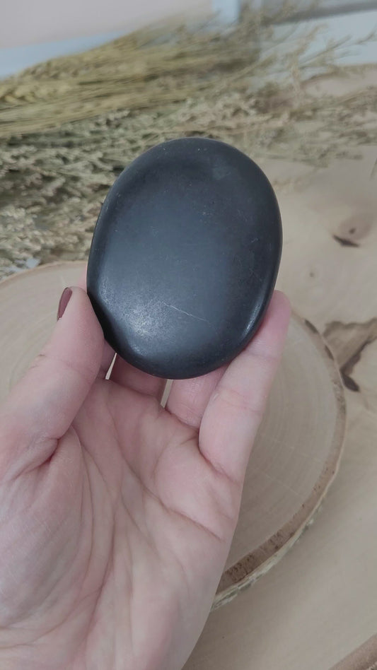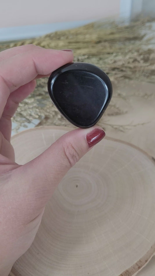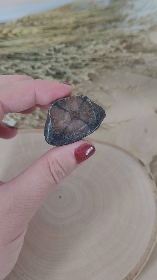 • Pegmatit Nephelin-Syenit Trommelstein mit seltenen Mineralien auf einer Holzscheibe fotografiert.