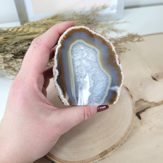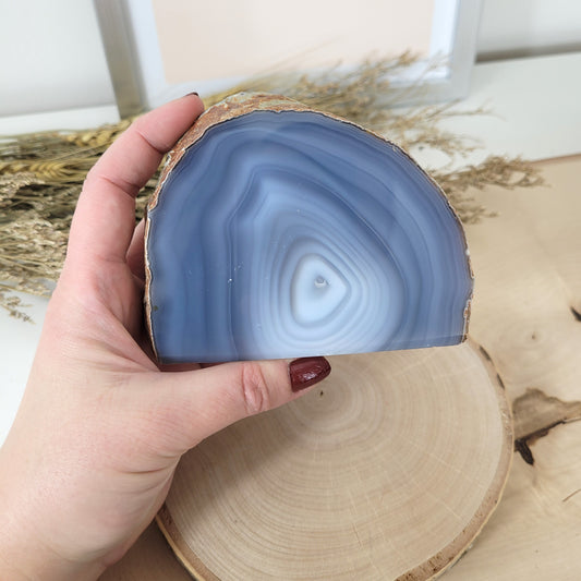 Achat Geode mit Standfläche blaugraue Naturfarbe mit Chalcedon 8,3 x 10,3 cm, 573g