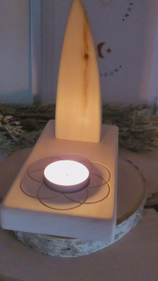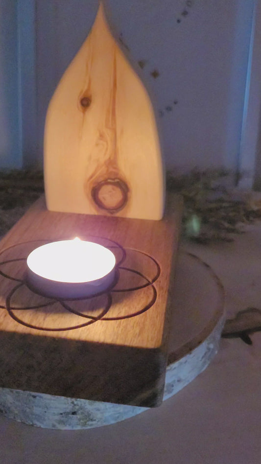 Zirbenholz Seelenlicht "Geborgenheit" Teelichthalter auf Zirbenholz Sockel mit Samen des Lebens Gravur, Samen aus Nussholz