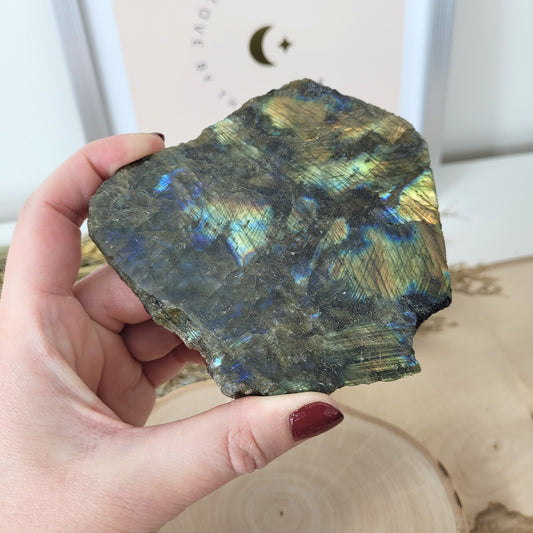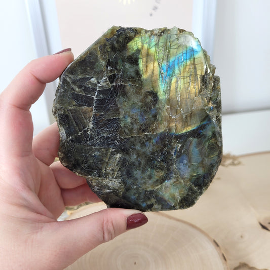Labradorit Scheibe Rohstein Naturrand 10,3 x 8,6cm, 154g