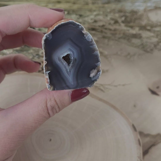 Die Achat Geode mit Standfläche hat eine Größe von 4,1 x 3 cm und wiegt 70g. Es handelt sich genau um den Achat, der auf den Bildern zu sehen ist.