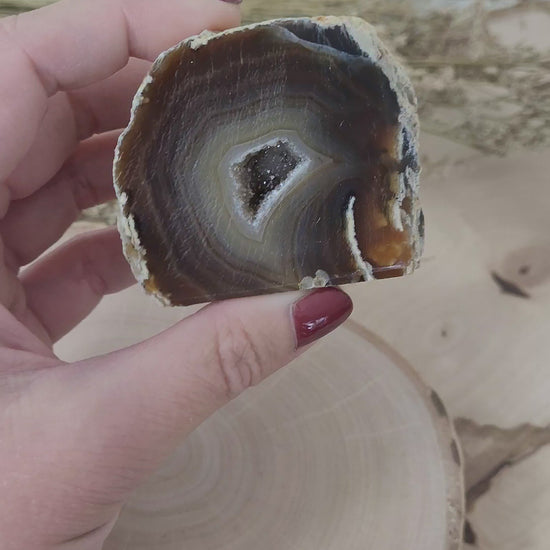 Diese wunderschöne Achat Geode ist rundum naturbelassen in seinem Geodengestein und nur vorderseitig poliert und mit einer Standfläche versehen. Der Achat fasziniert mit seinen Naturfarben, seiner glitzernden Kristalldruse und teils mit seiner Bänderung und Dendriten im Inneren (pflanzenförmig kristallisierte Eisen-Mangan Einschlüsse).