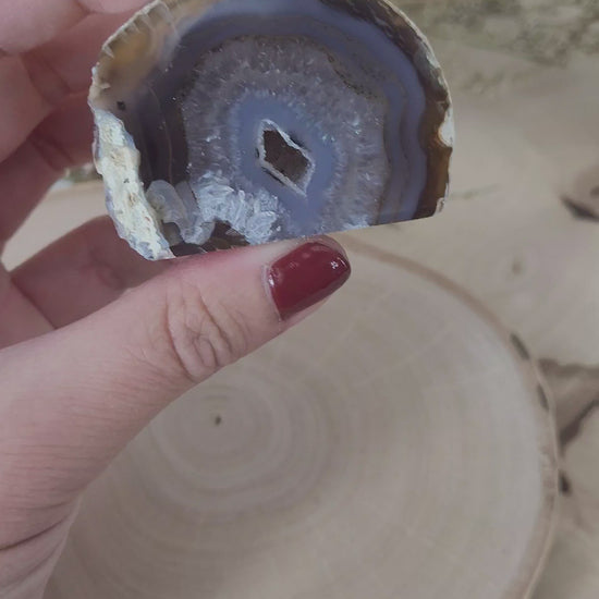 Die Achat Geode mit Standfläche hat eine Größe von 4 x 5,1 cm und wiegt 108g. Es handelt sich genau um den Achat, der auf den Bildern zu sehen ist.