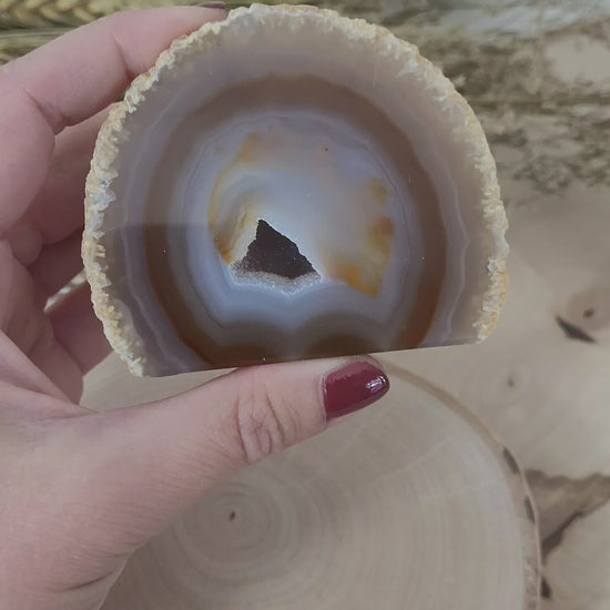 Die Achat Geode mit Standfläche hat eine Größe von 6,3 x 7,5 cm und wiegt 227g. Es handelt sich genau um den Achat, der auf den Bildern zu sehen ist.