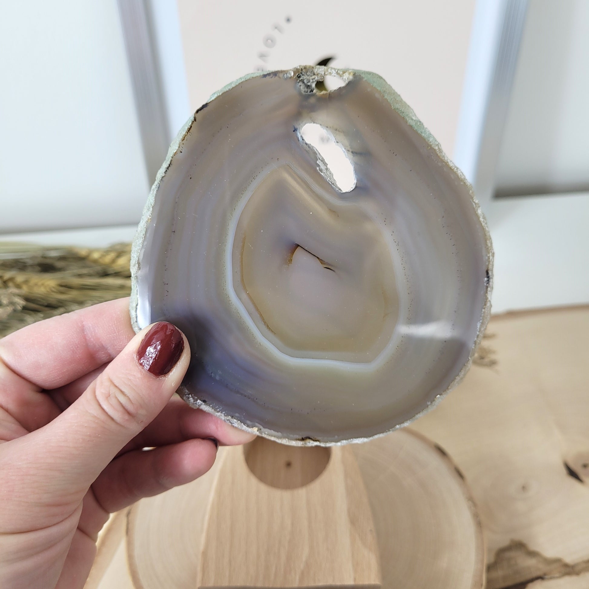 Die Achat Scheibe hat eine Größe von 10,3 x 9,9 cm und wiegt 119g. Es handelt sich genau um die Achat Scheibe mit Holzaufsteller, die auf den Bildern zu sehen ist.