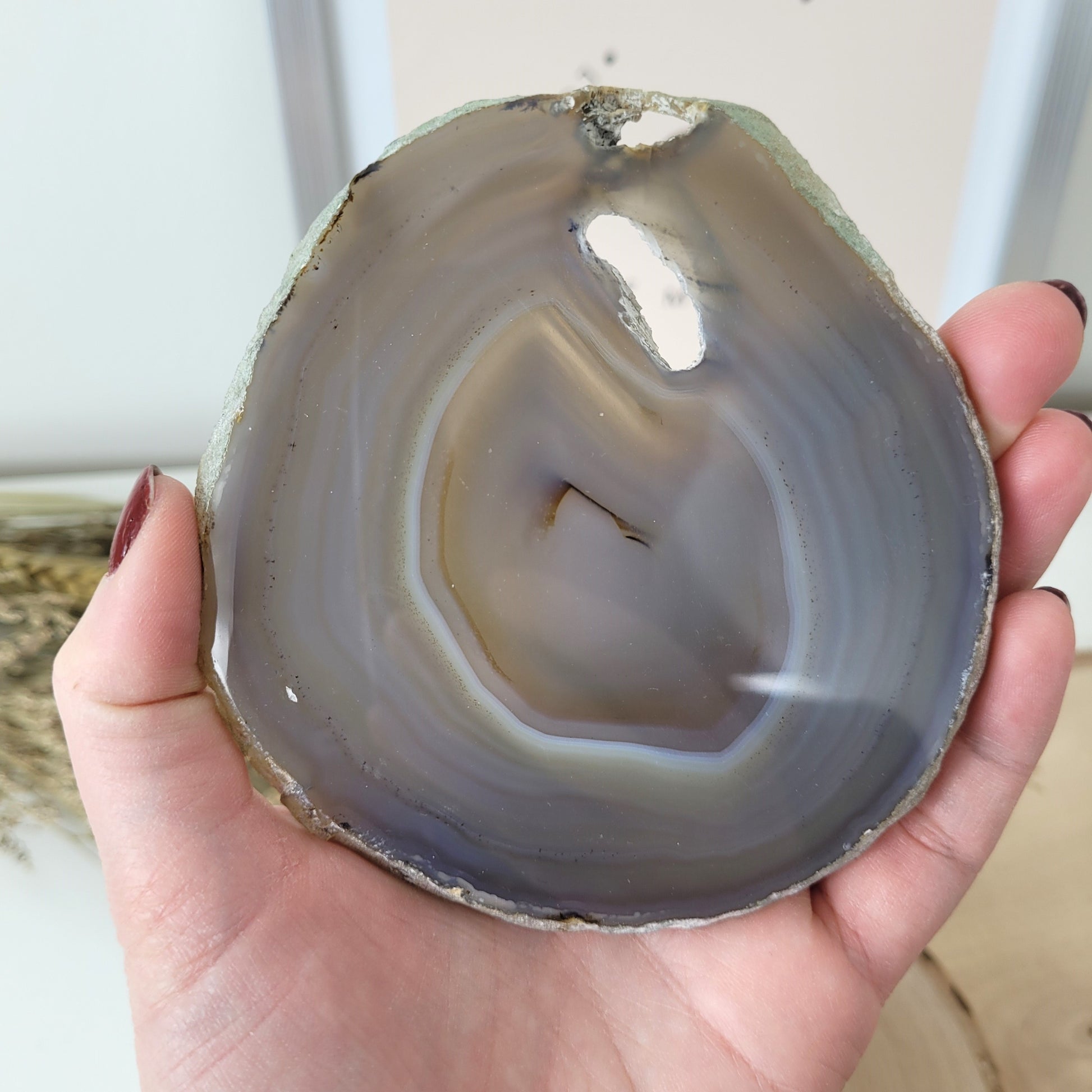 Diese Achat Scheibe hat eine natürliche Drusenöffnung, diese ist aber kantig und nicht glitzernd, daher vergünstigt im Preis berücksichtigt.