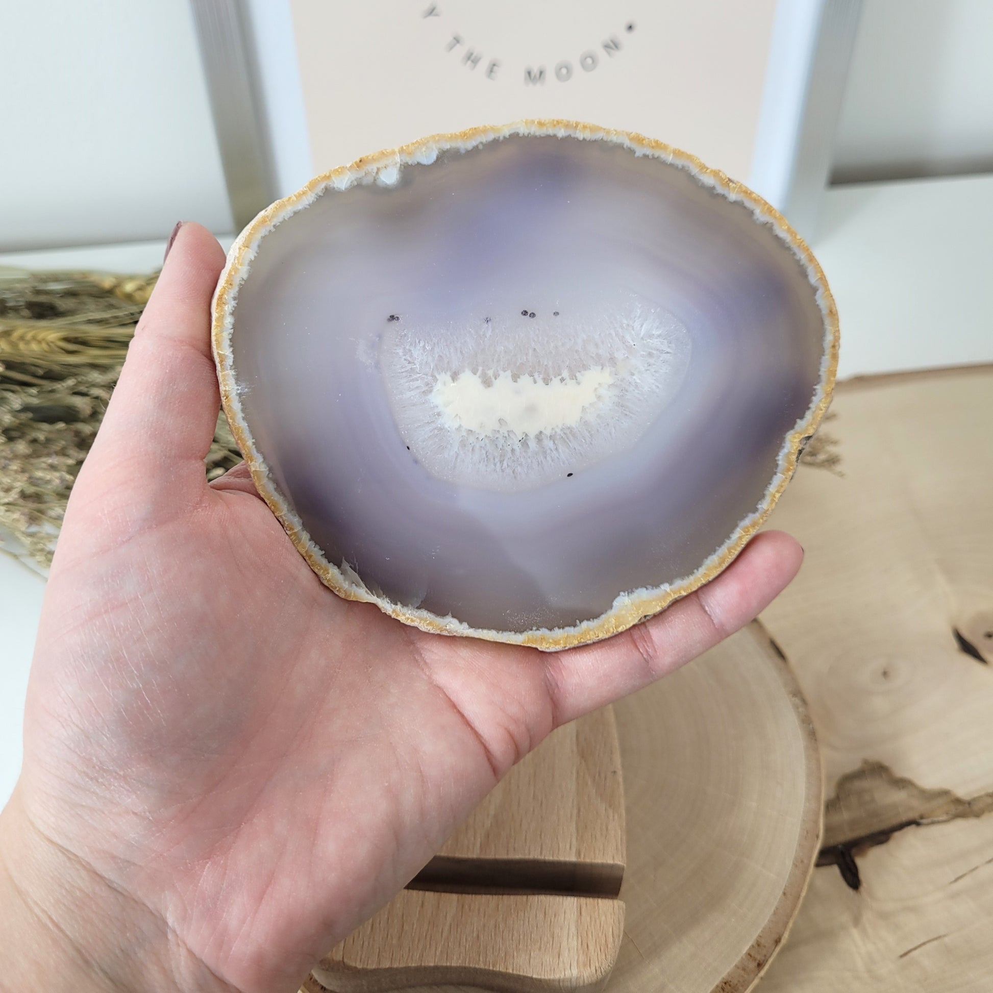Die Achat Scheibe hat eine Größe von 9,6 x 11,3 cm und wiegt 150g. Es handelt sich genau um die Achat Scheibe mit Holzaufsteller, die auf den Bildern zu sehen ist.