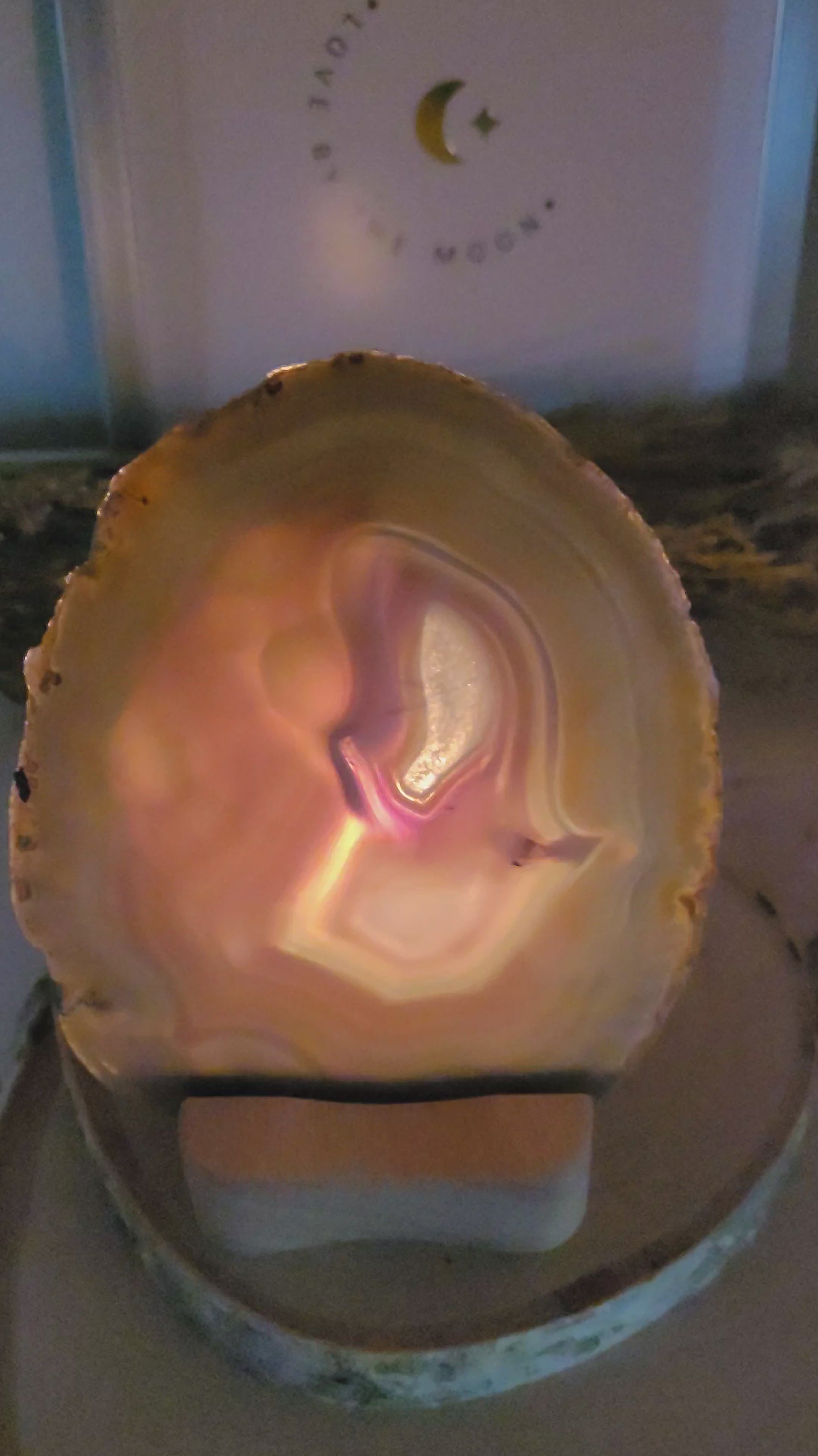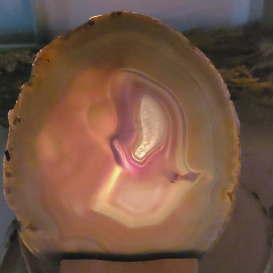 Diese wunderschöne Achat Scheibe fasziniert mit ihren Naturfarben, ihrer Bänderung und wilden Mustern. Die flach geschliffene Achat Scheibe strahlt mit einem Teelicht durchleuchtet in ihrer vollsten Pracht und wird inklusive einem passendem Holzaufsteller mit Teelichthalter geliefert.