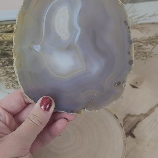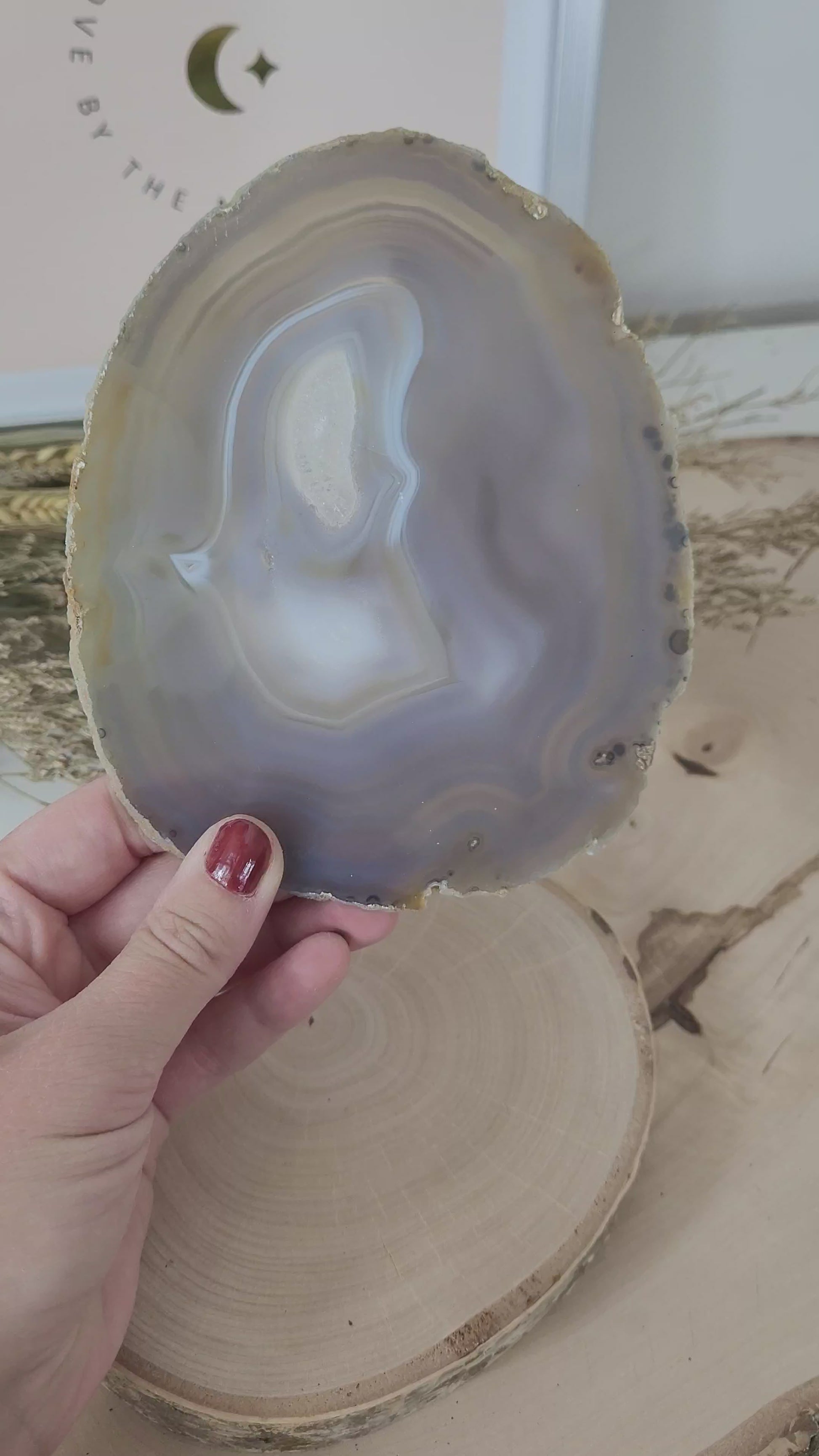 Die Achat Scheibe hat eine Größe von 13,9x11,3cm und wiegt 132g. Es handelt sich genau um die Achat Scheibe mit Holzaufsteller, die auf den Bildern zu sehen ist.