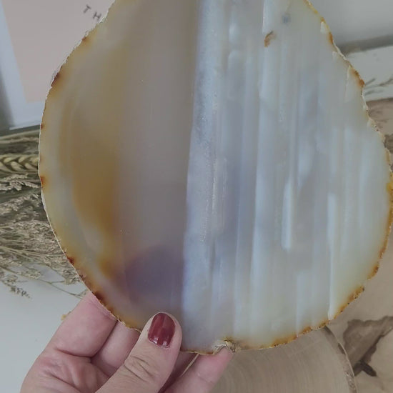 Die Achat Scheibe hat eine Größe von 16x14,5cm und wiegt 191g. Es handelt sich genau um die Achat Scheibe mit Holzaufsteller, die auf den Bildern zu sehen ist.