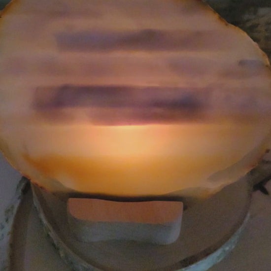 Diese wunderschöne Achat Scheibe fasziniert mit ihren Naturfarben, ihrer Bänderung und wilden Mustern. Die flach geschliffene Achat Scheibe strahlt mit einem Teelicht durchleuchtet in ihrer vollsten Pracht und wird inklusive einem passendem Holzaufsteller mit Teelichthalter geliefert.