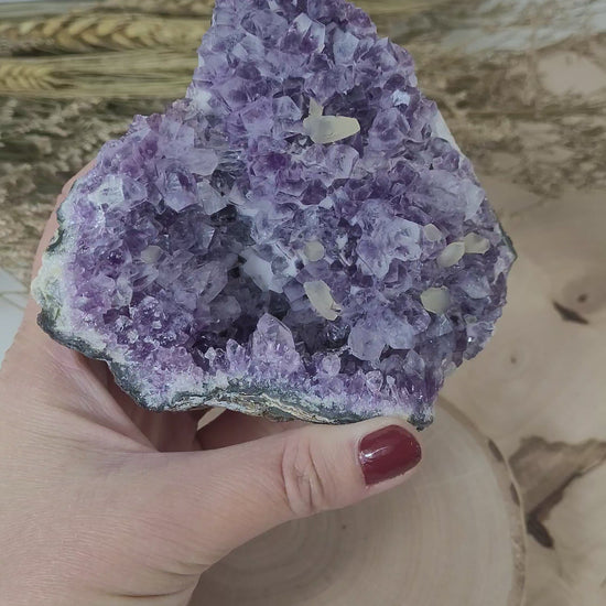 Diese wunderschöne Amethyst Kristalldruse mit ihrer intensiven Farbgebung und ausgeprägten Kristallbildung ist faszinierend verwachsen mit Calcit Kristallen, welche sich auf der Amethystdruse gebildet haben. Bei dieser Amethystdruse verläuft der Calcit auch wunderschön glitzernd adernartig in schneeweißer Farbgebung um die Amethyst Kristalle. Die Amethystdruse ist mit einer Standfläche versehen.