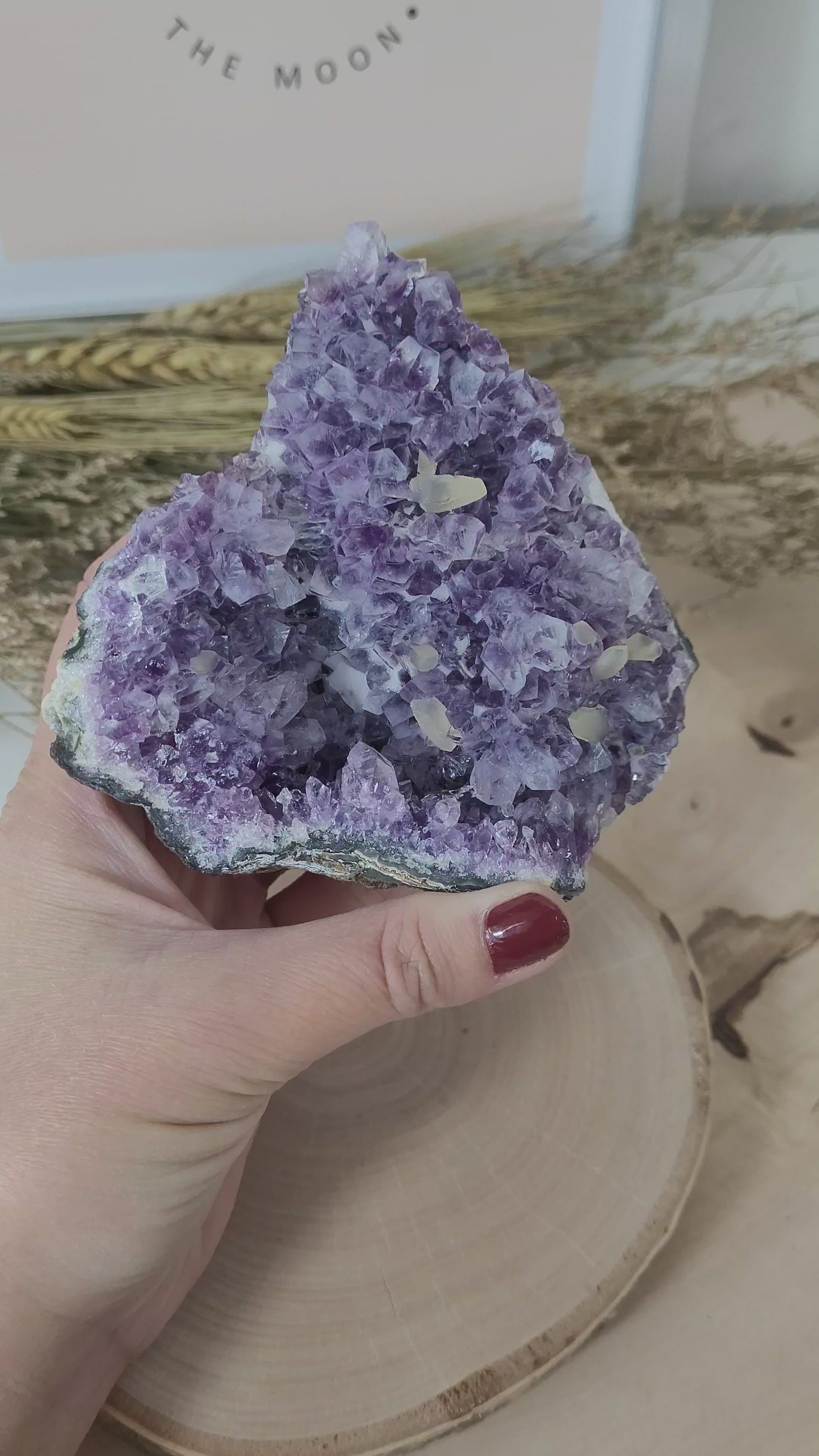 Diese Amethystdruse hat eine Größe von 9,2x8,9cm und ein Gewicht von 464g. Es handelt sich genau um die Amethystdruse mit Calcit, die auf den Bildern zu sehen ist.
