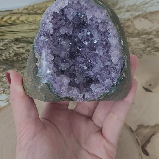 Diese Amethyst Kristalldruse hat eine Größe von 7,7x8,6cm und wiegt 461g. Es handelt sich genau um den Amethyst, der auf den Bildern zu sehen ist.