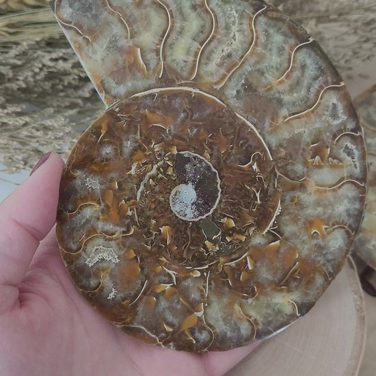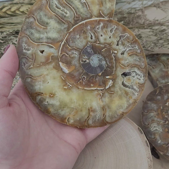 Ammoniten Hälften Fossilien Paar groß 13 x 10,8 cm, 547g inklusive Aufsteller