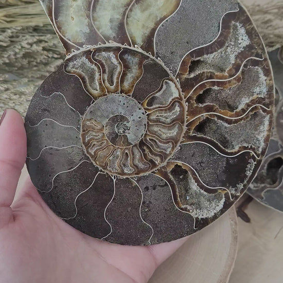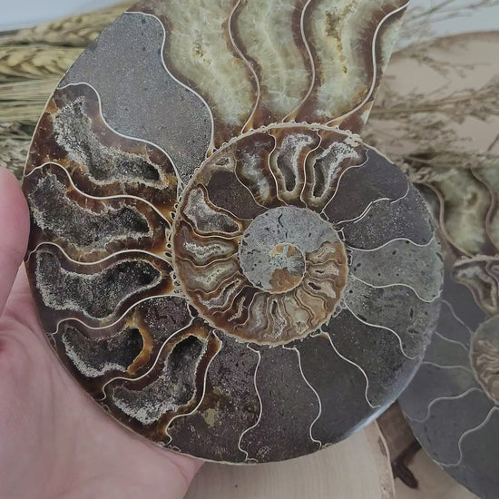 Ammoniten Hälften Fossilien Paar groß 15 x 11,6 cm, 805g inklusive Aufsteller