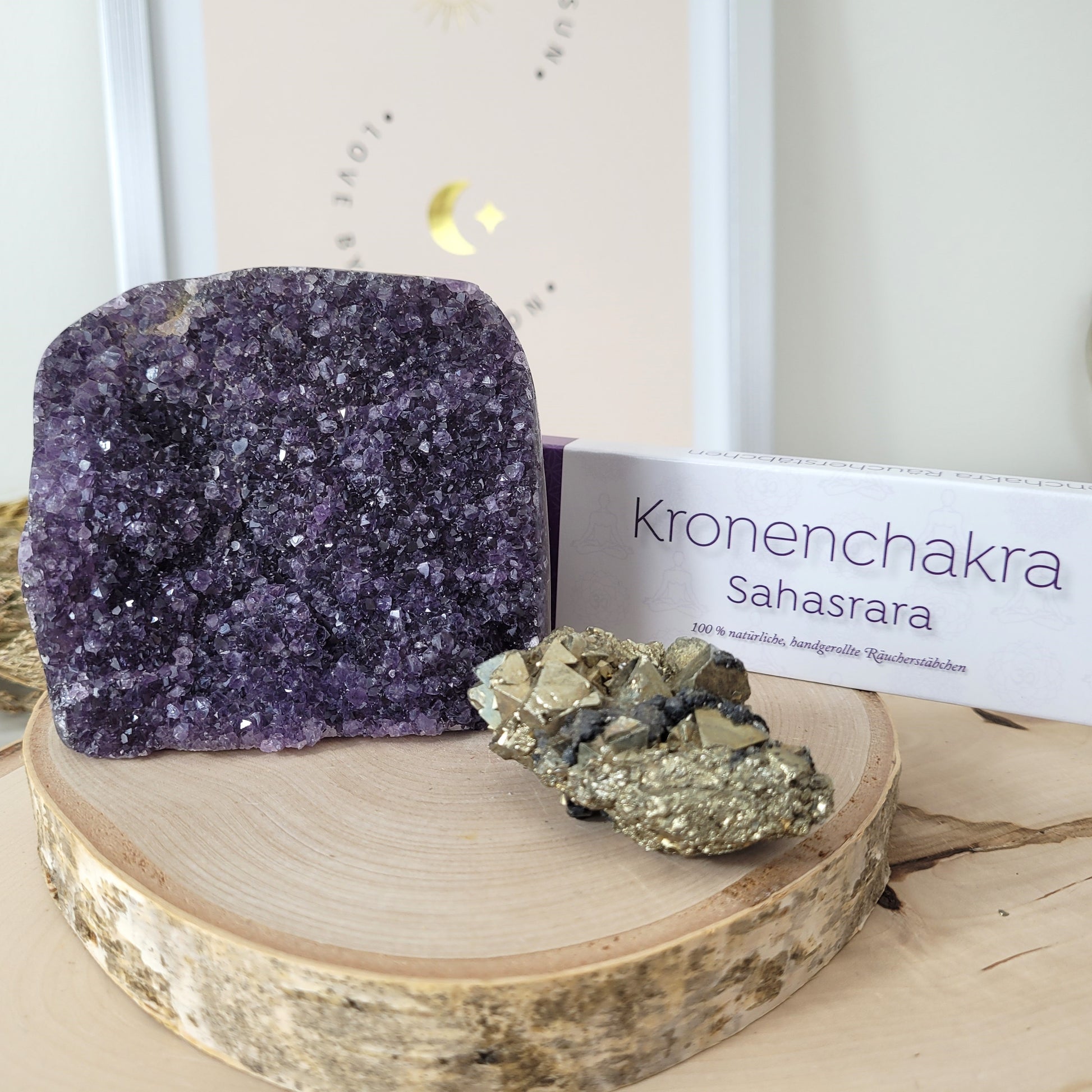 Angebot des Tages 22.02.2026 Set bestehend aus: Amethyst Kristalldruse, Pyrit mit Hämatit Kristallstufe, Räucherstäbchen Kronenchakra
