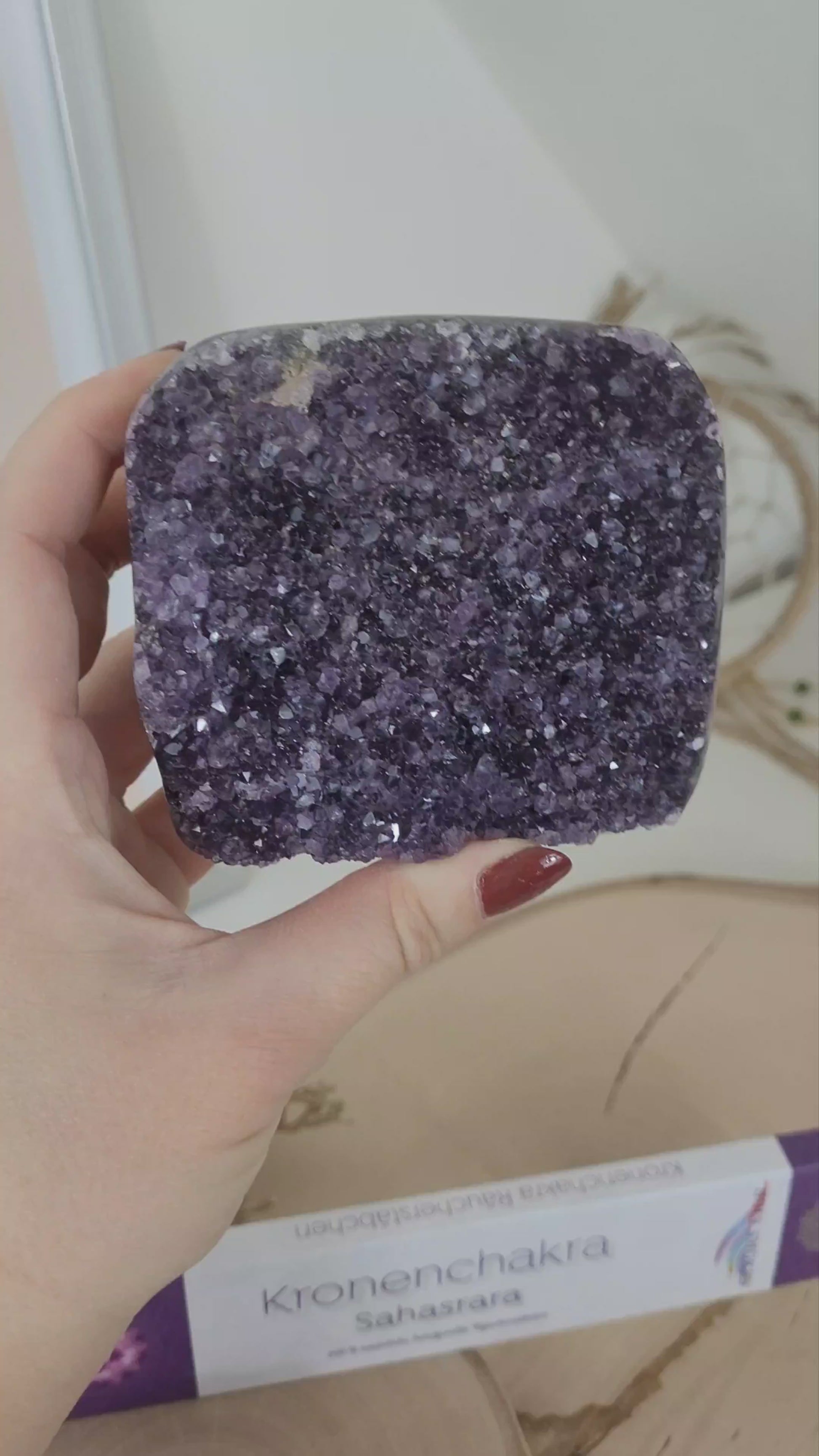 1x Amethyst Kristalldruse, 8 x 8,9cm, 605g, diese wunderschöne Amethyst Kristalldruse fasziniert mit ihrer intensiven dunklen Farbgebung der Kristalle, ihrer ausgeprägte Kristallbildung und ihrem zauberhaften Funkeln über die gesamte Kristalldruse, die Kristalldruse ist mit einer Standfläche versehen und sonst in ihrer Form naturbelassen. (Einzelpreis 49€)