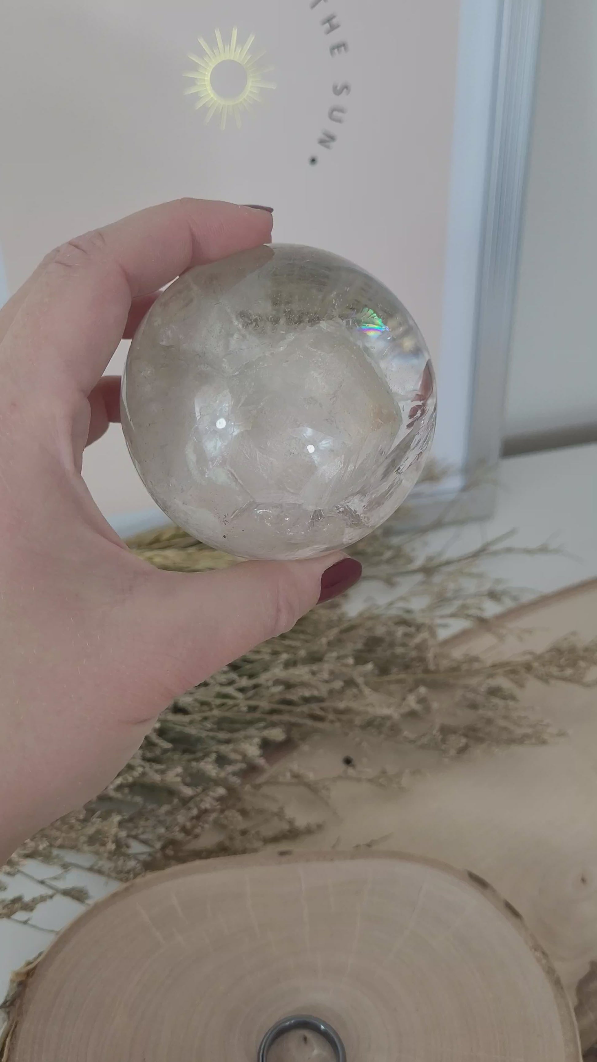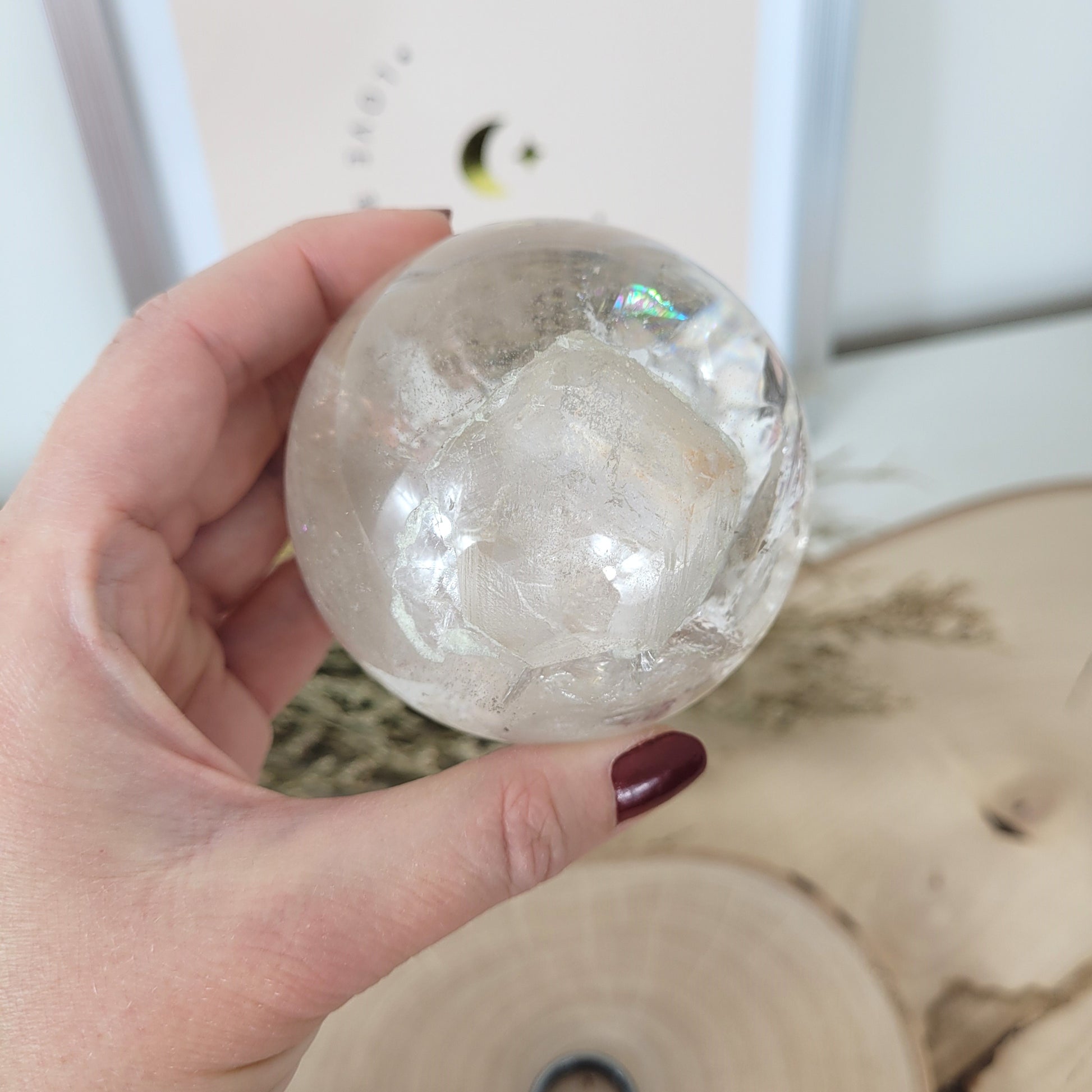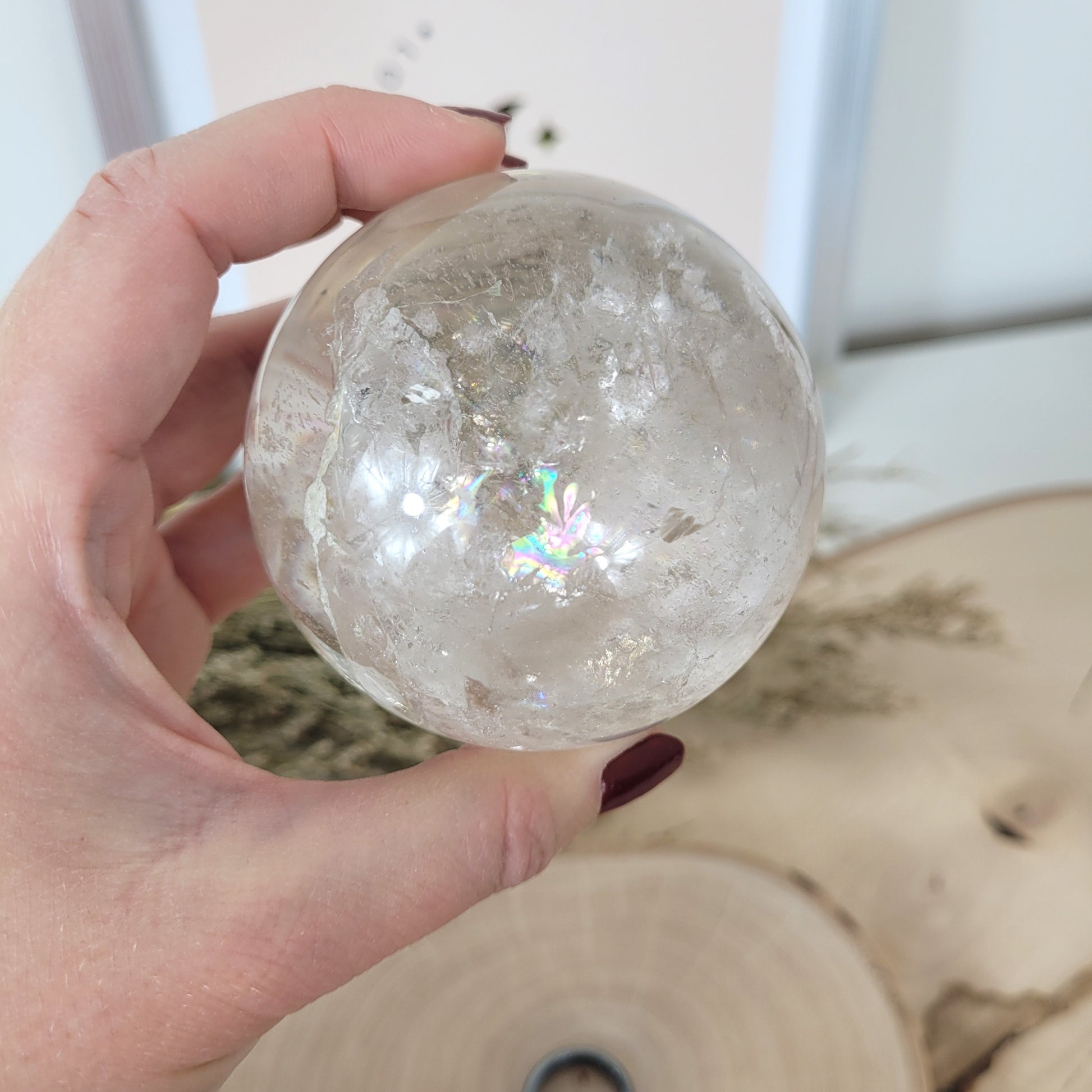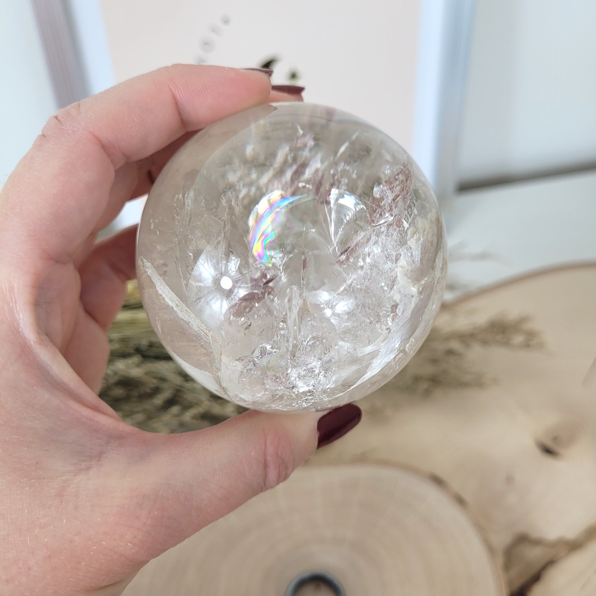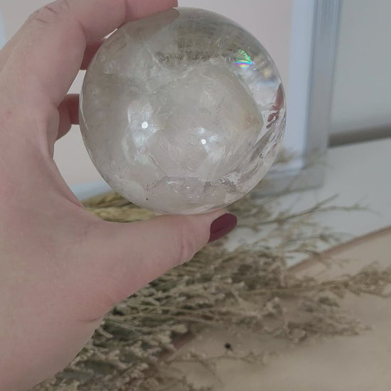 Diese wunderschöne Bergkristall Kugel ist wirklich was besonderes! Der Bergkristall der hier in Kugelform geschliffen wurde ist wundervoll klar in seiner Struktur mit einem faszinierendem Innenleben und zahlreiche, große Regenbögen bei Lichteinfall.