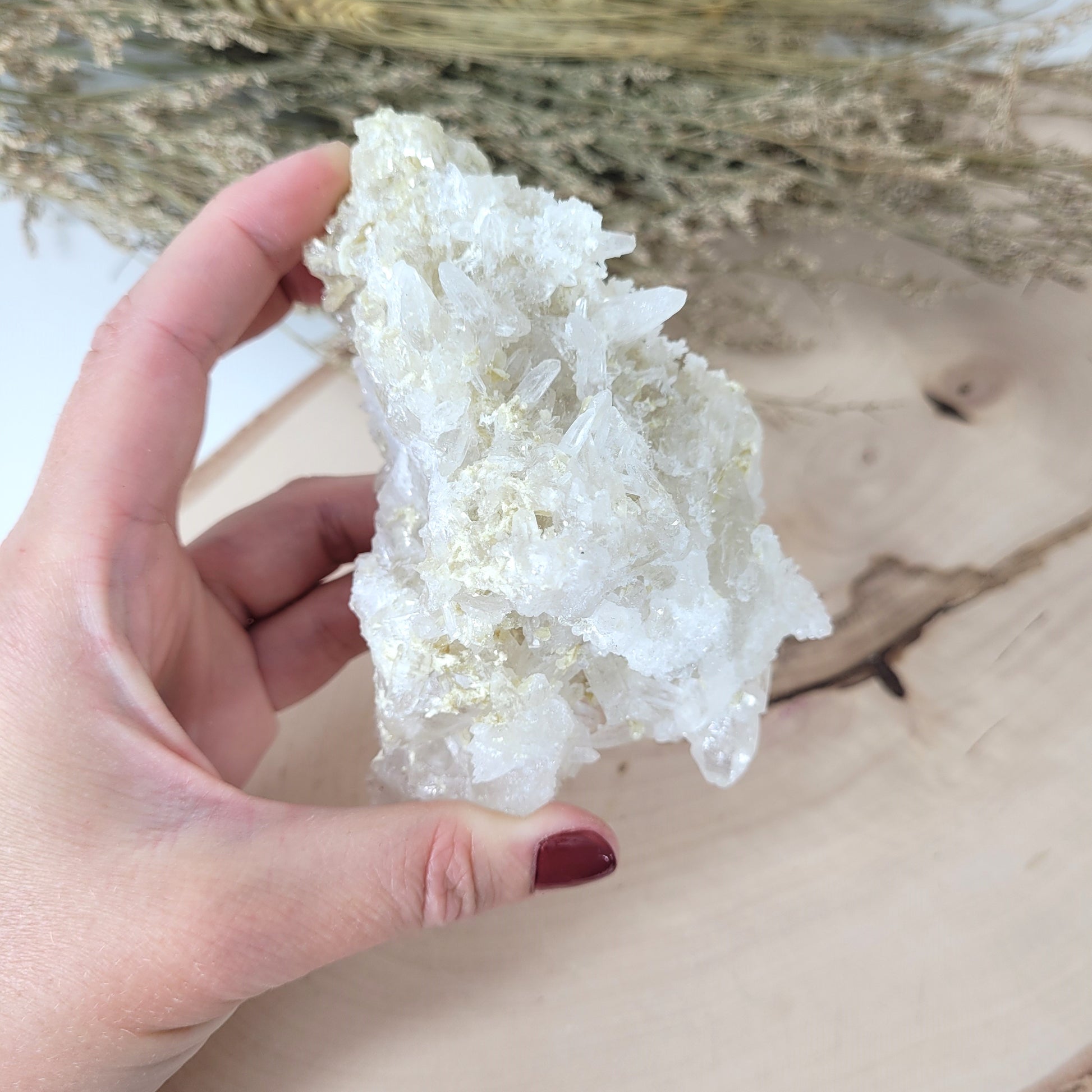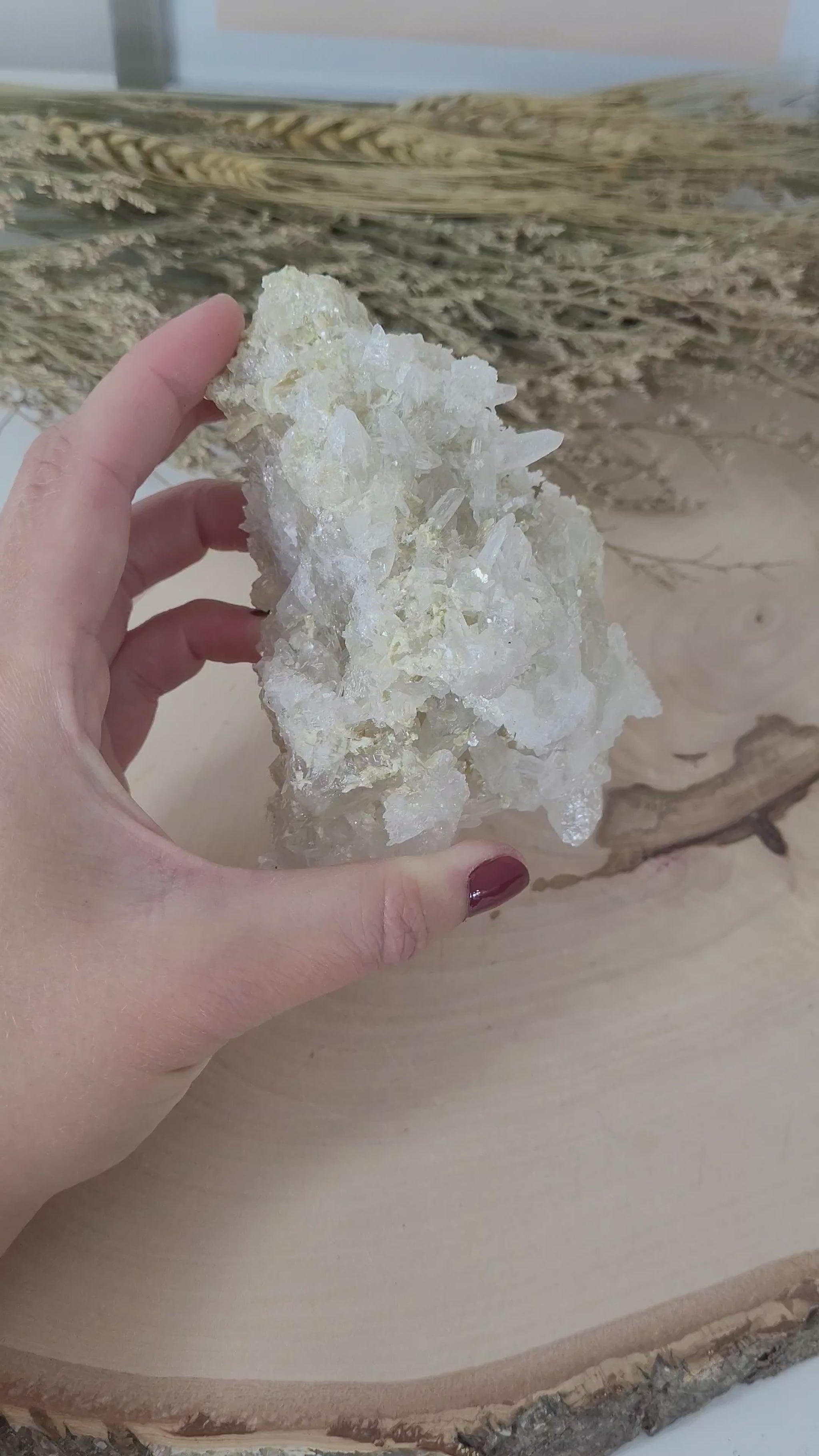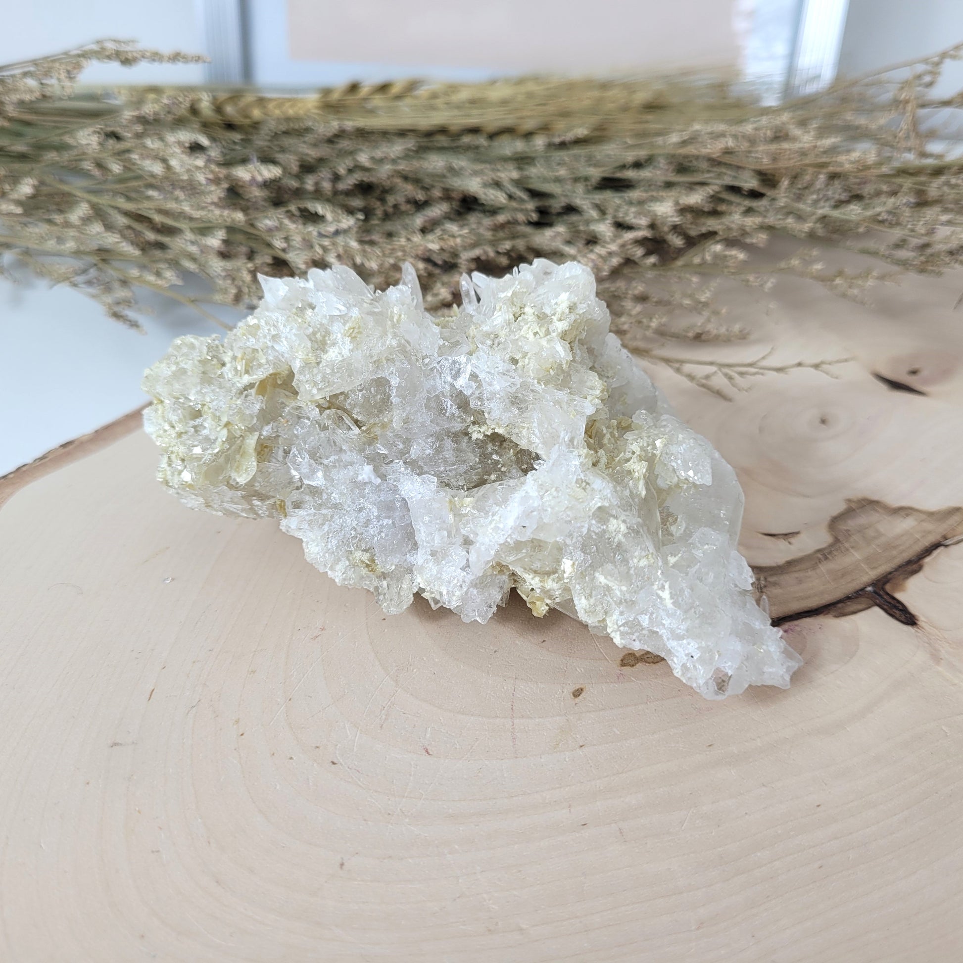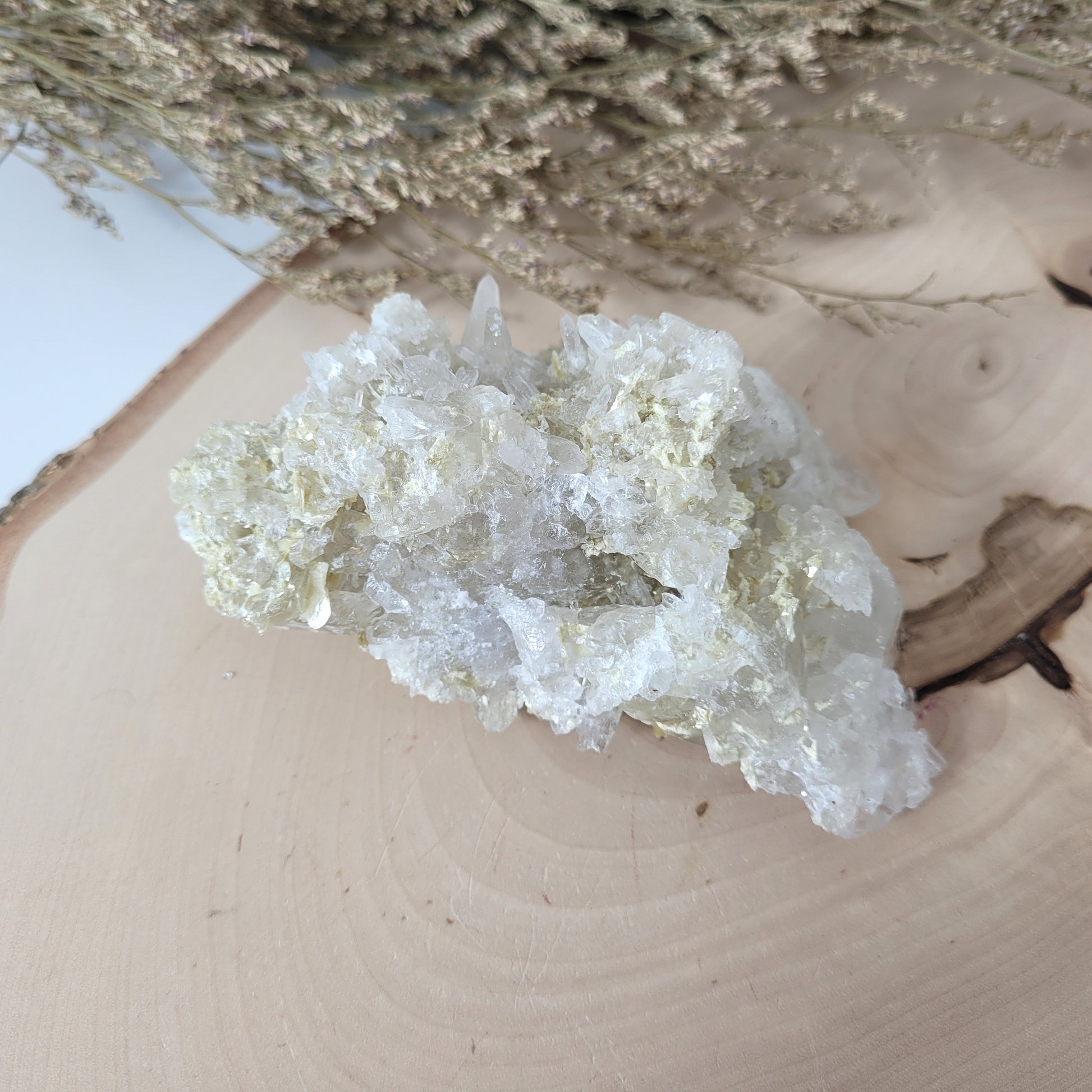 Beim Muskovit handelt es sich um ein Glimmermineral, welches feine fast schon blätterartige Kristalle bildet. Die Naturfarben vom Muskovit sind von blass gelblich bis grünlich. Muskovit Kristalle sind äußerst sensibel, da sie sehr dünn sind und wie kleine Plättchen auf dem Bergkristall verwachsen, da können Einzelkristalle bei zu starkem Anfassen brechen.