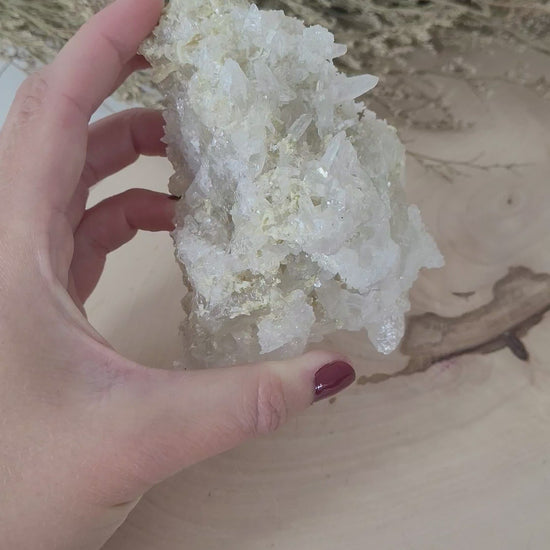Auf diesen faszinierenden Bergkristallstufen aus Südafrika sind neben Muskovit teilweise auch Calcit verwachsen. Als sogenannter Sugar Calcit also mikrokleine Kristalle mit einem wunderschönen Funkeln.