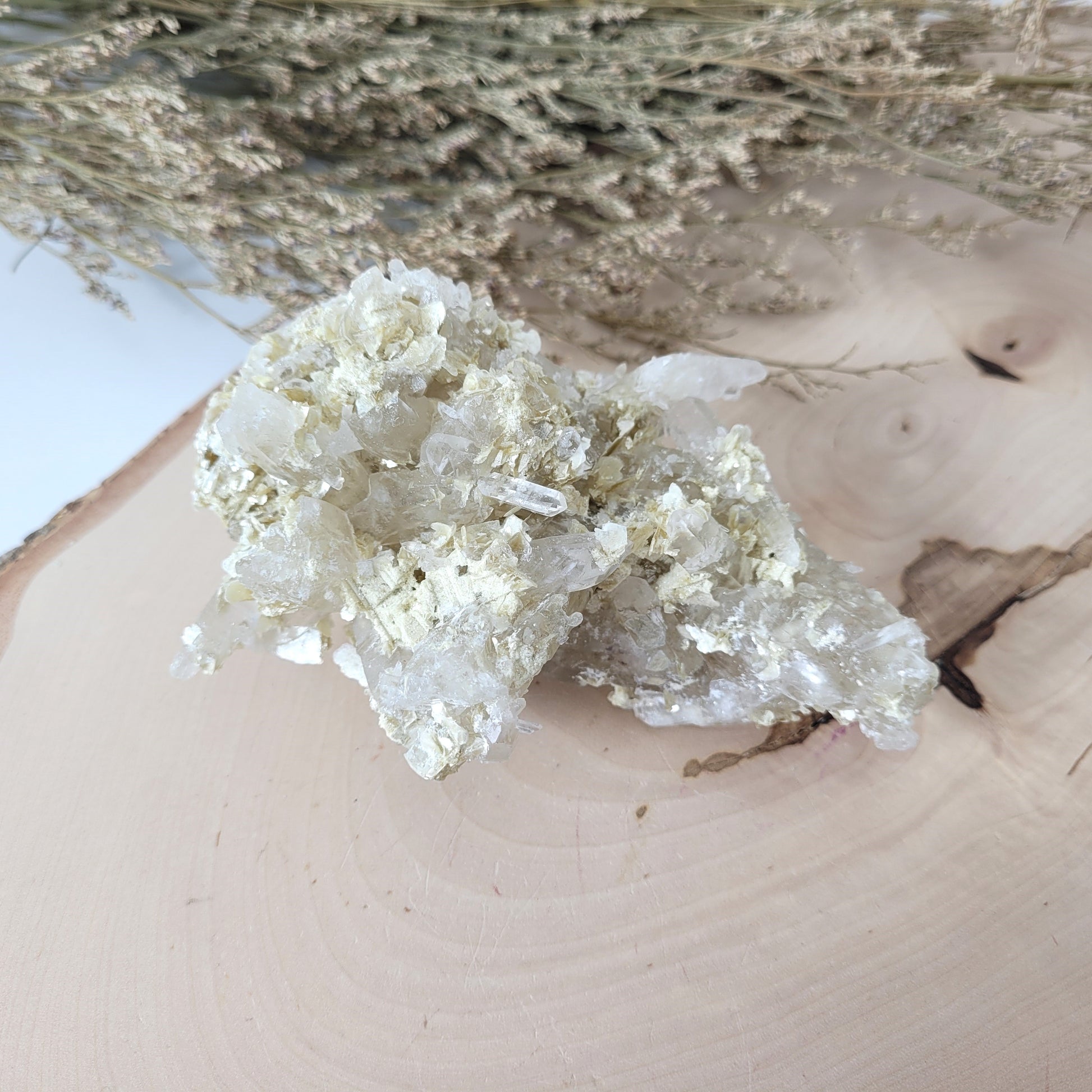 Beim Muskovit handelt es sich um ein Glimmermineral, welches feine fast schon blätterartige Kristalle bildet. Die Naturfarben vom Muskovit sind von blass gelblich bis grünlich. Muskovit Kristalle sind äußerst sensibel, da sie sehr dünn sind und wie kleine Plättchen auf dem Bergkristall verwachsen, da können Einzelkristalle bei zu starkem Anfassen brechen.