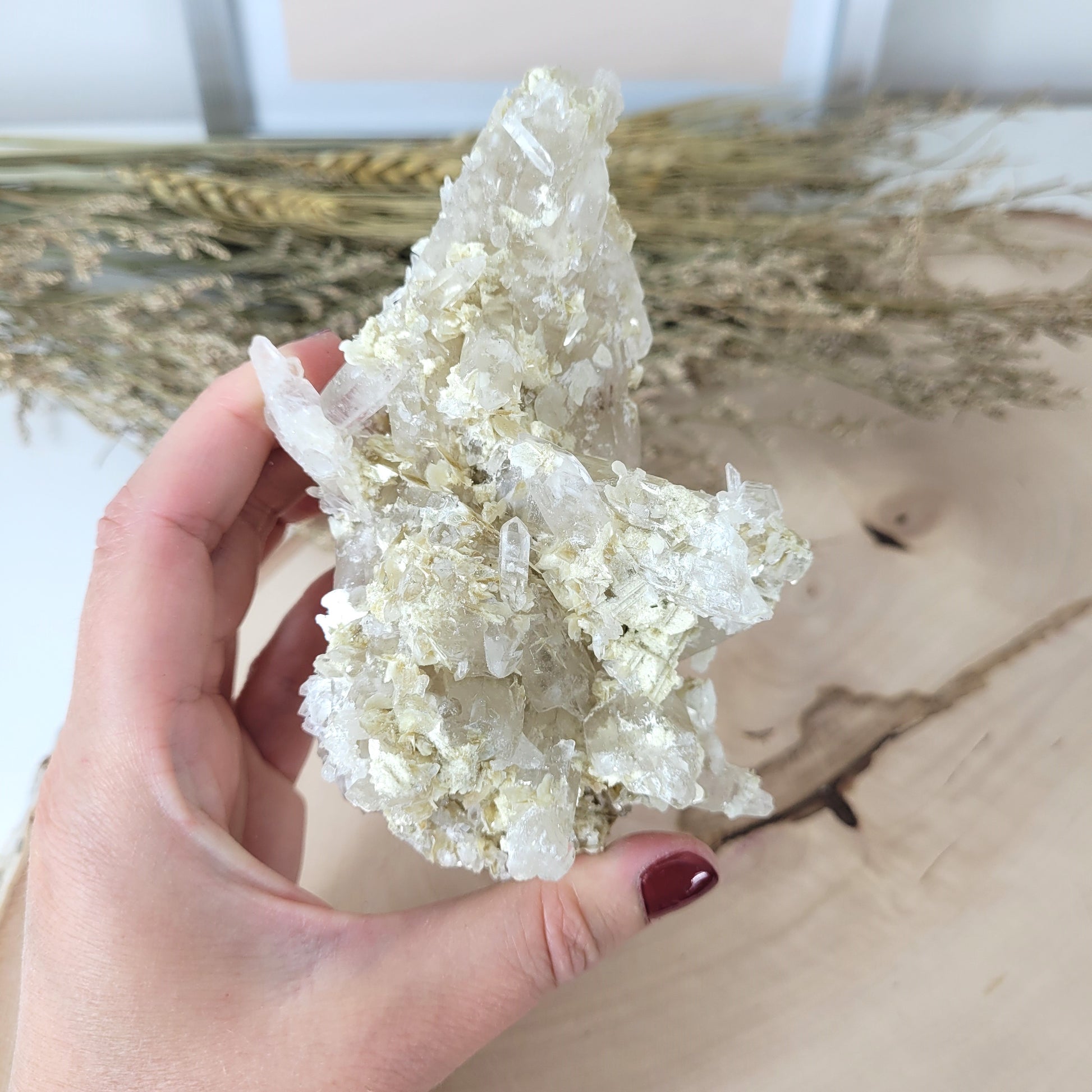 Es handelt sich genau um die besondere Bergkristallstufe, die auf den Bildern zu sehen ist, mit einer Größe von 11,6 x 7,6 cm und einem Gewicht von 297g.