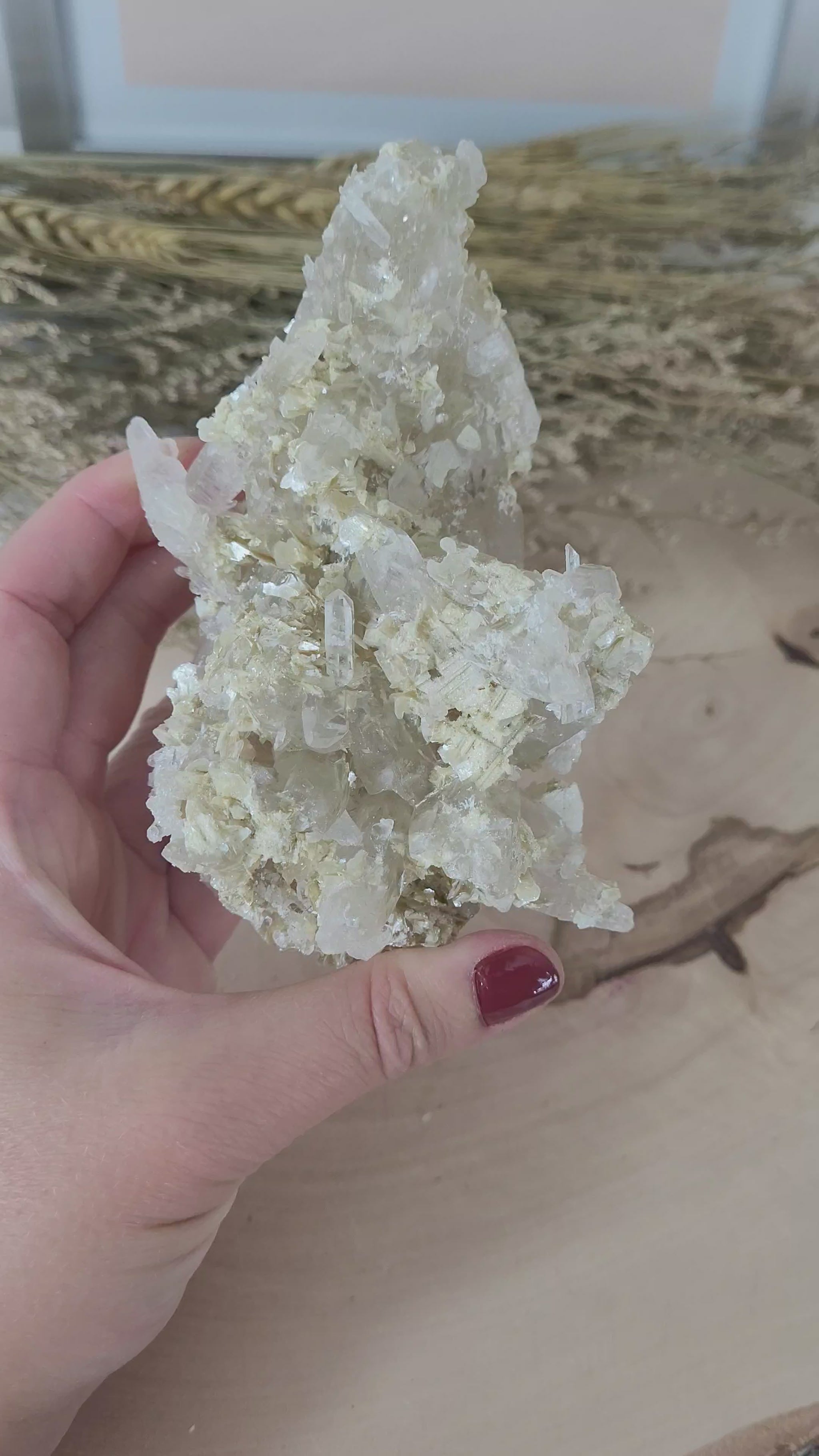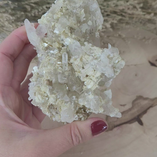 Auf diesen faszinierenden Bergkristallstufen aus Südafrika sind neben Muskovit teilweise auch Calcit verwachsen. Als sogenannter Sugar Calcit also mikrokleine Kristalle mit einem wunderschönen Funkeln.