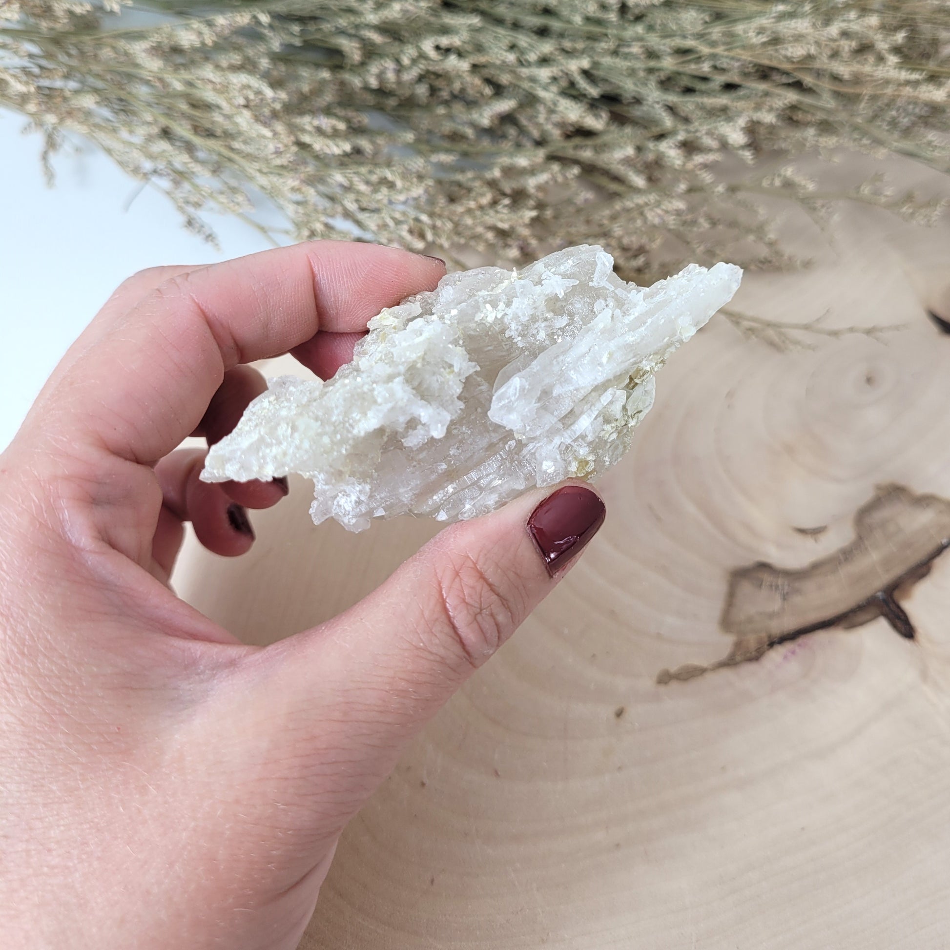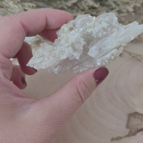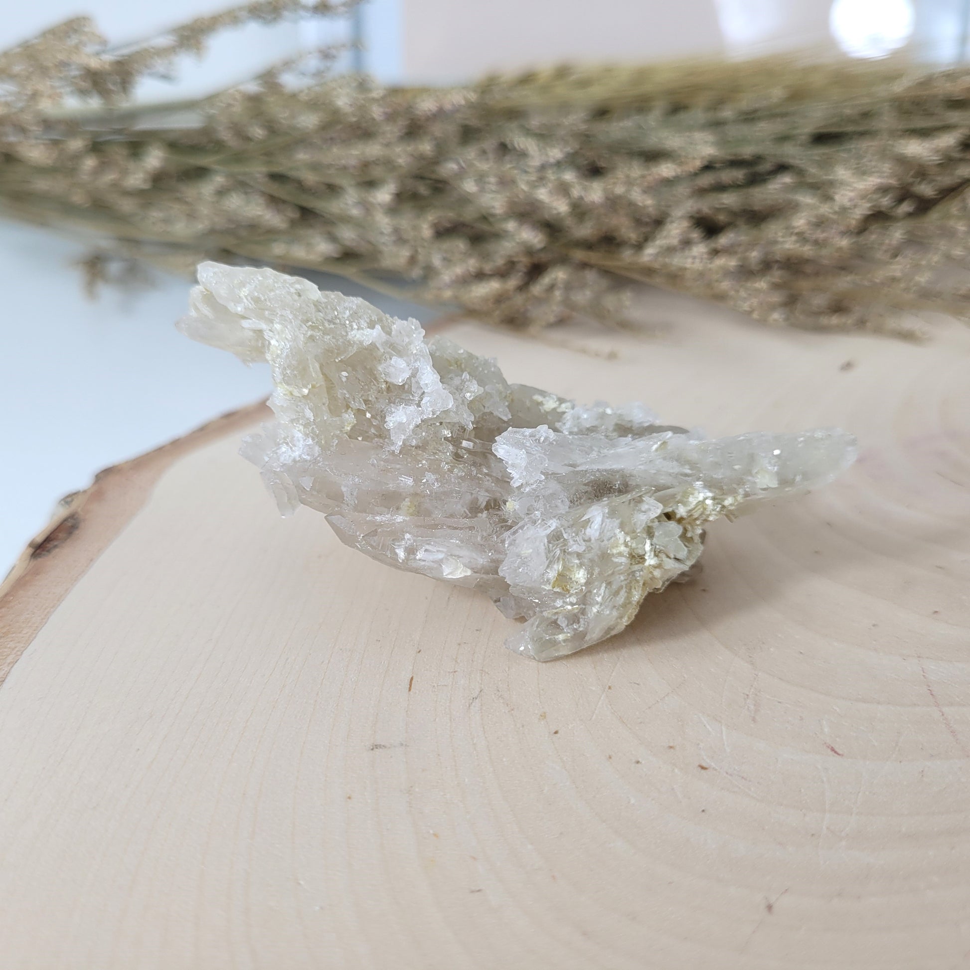 Beim Muskovit handelt es sich um ein Glimmermineral, welches feine fast schon blätterartige Kristalle bildet. Die Naturfarben vom Muskovit sind von blass gelblich bis grünlich. Muskovit Kristalle sind äußerst sensibel, da sie sehr dünn sind und wie kleine Plättchen auf dem Bergkristall verwachsen, da können Einzelkristalle bei zu starkem Anfassen brechen.