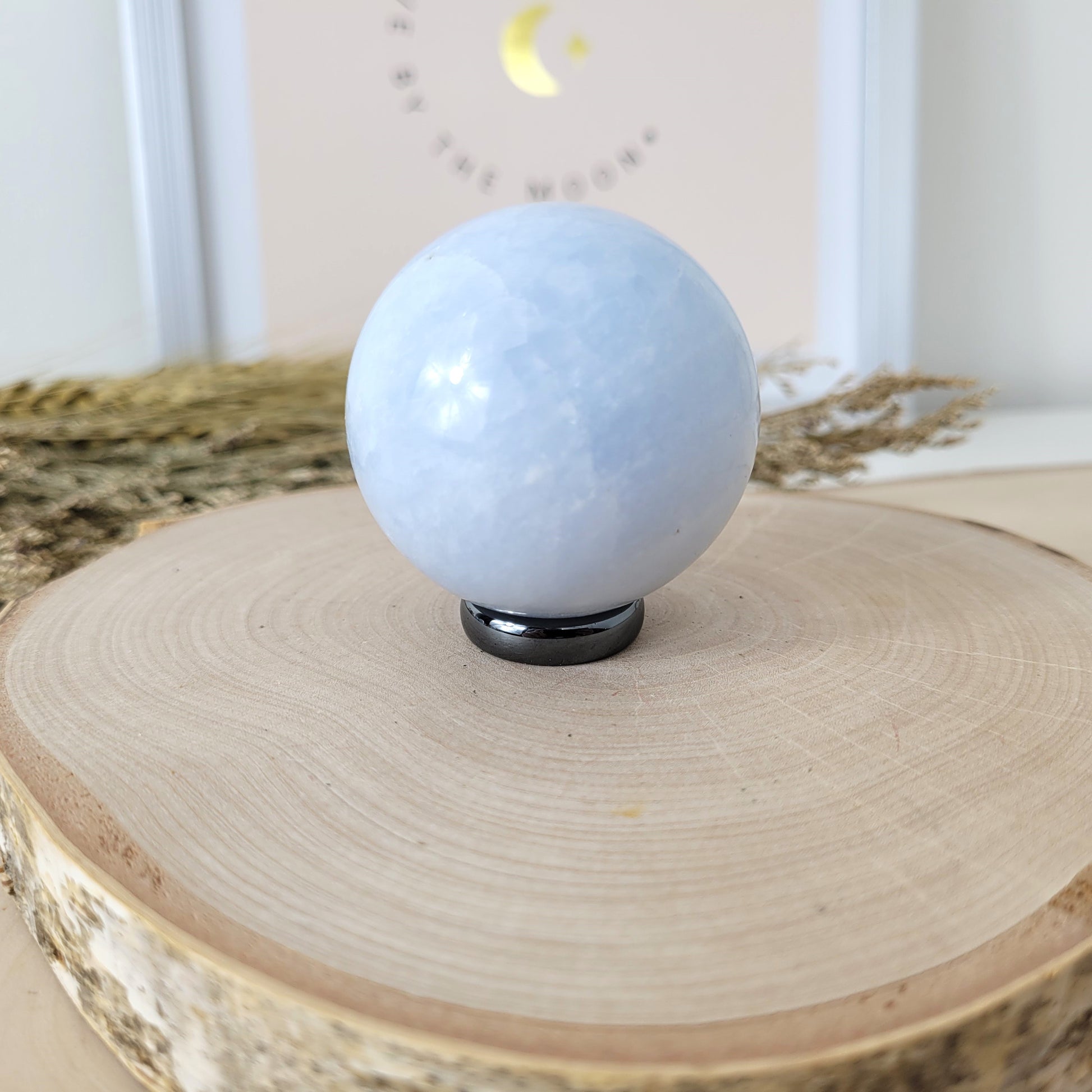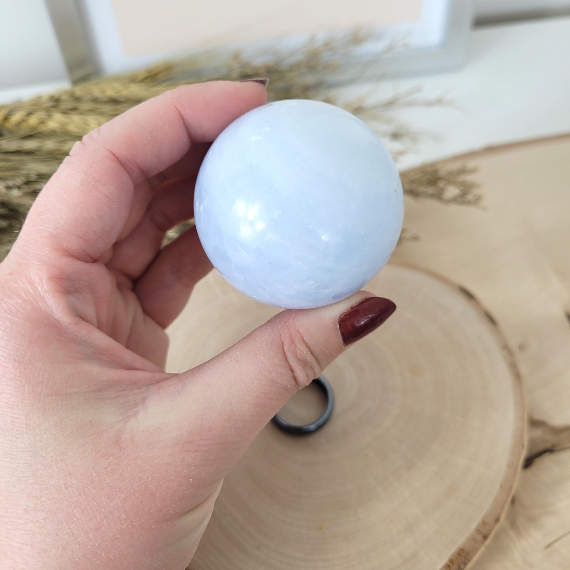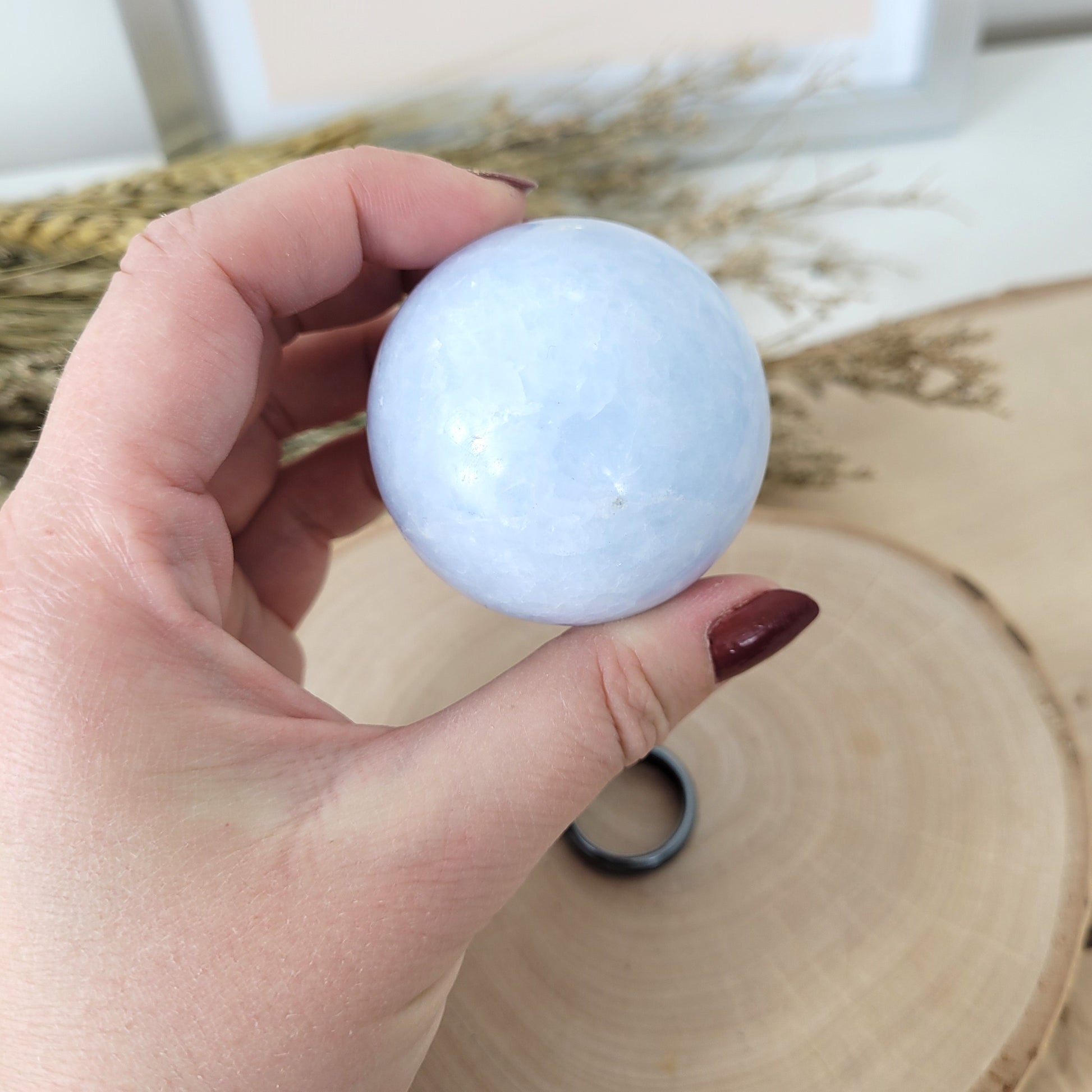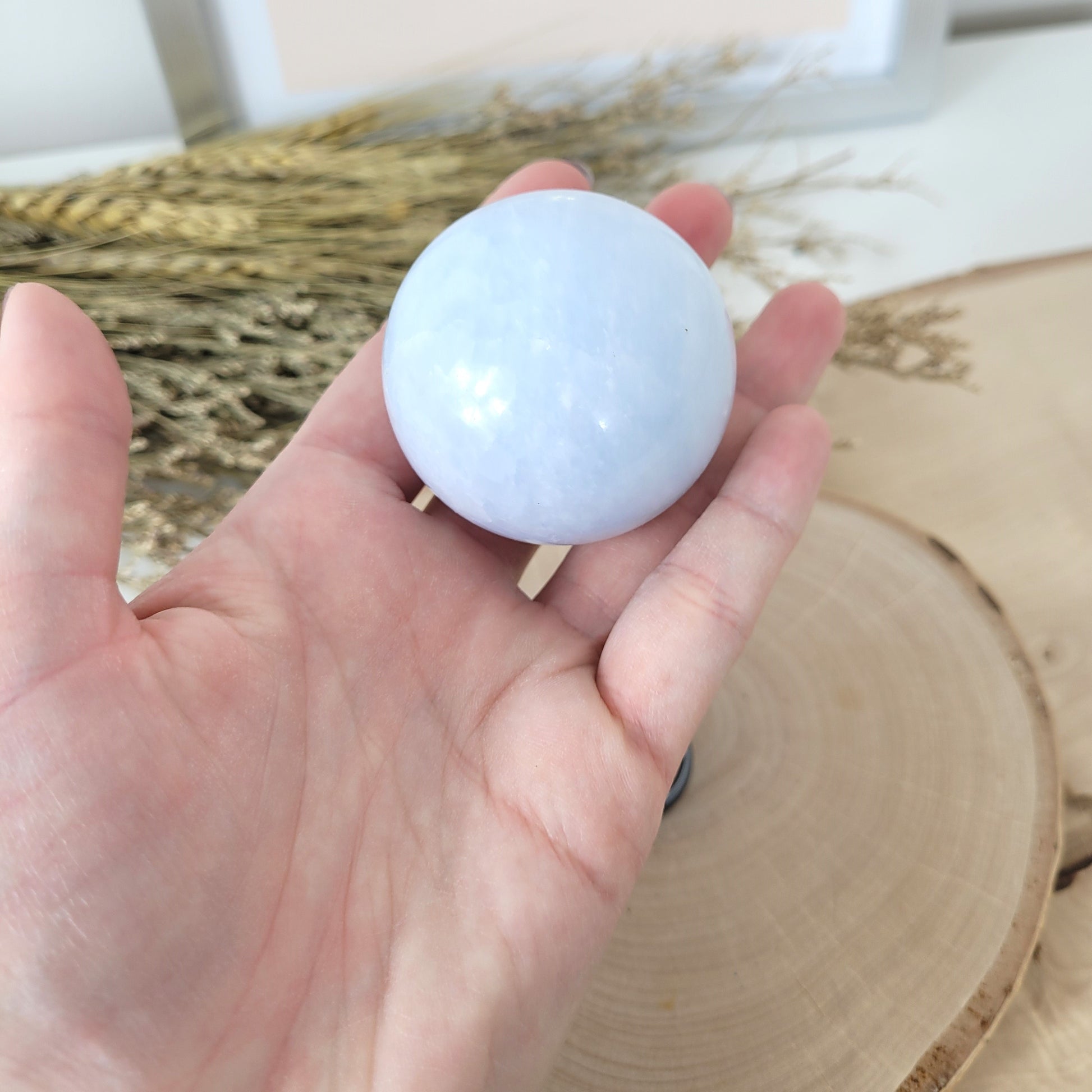 Die blaue Calcit Kugel hat einen Durchmesser von 4,9cm und wiegt 173g. Es handelt sich genau um die Kugel, die auf den Bildern zu sehen ist.