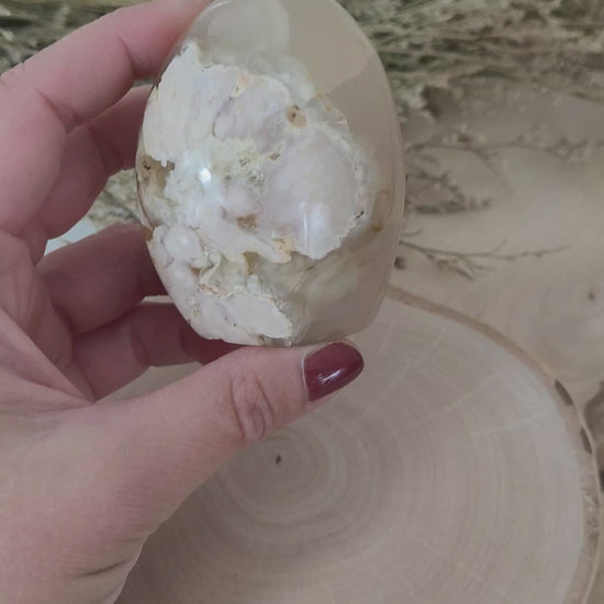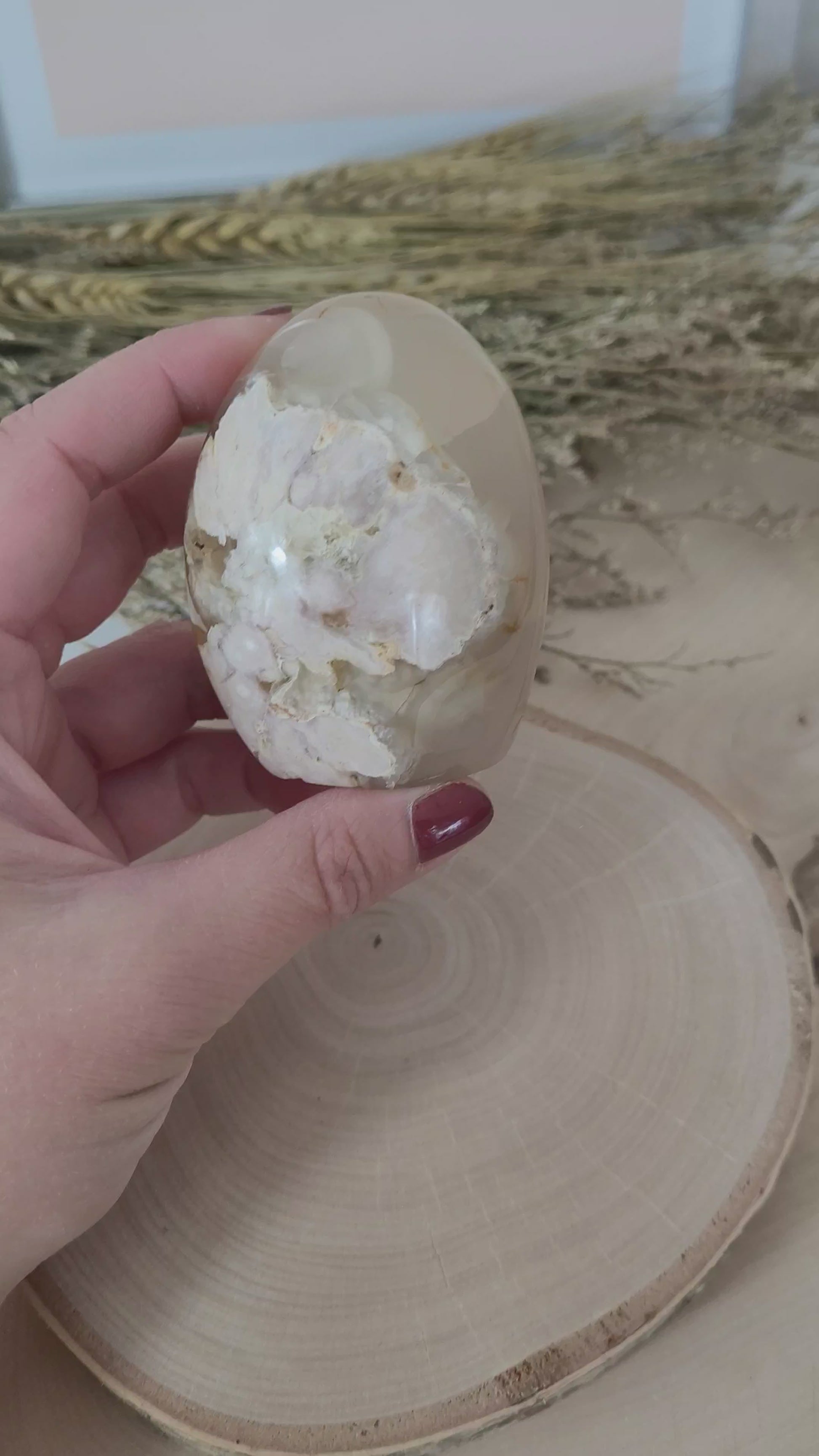 Diese wunderschöne kleine Blumenachat Freiform fasziniert mit ihren Naturfarben und den blumenähnlichen Mustern über das Gestein. welche dem Blumenachat ihren Namen verleihen. Blumenachat ist eine Gesteinsverwachsung von Achat mit den weiß, rosa, grünen blumenähnlichen Chalcedon Formationen äußerlich aber auch teils bis in klare Innere des Achats erkennbar. Blumenachat hat teilweise auch eine wunderschöne Bänderung und kleine Kristalldrusen. Einziger Fundort auf der Welt des wunderschönen Blumenachats ist Madagaskar.