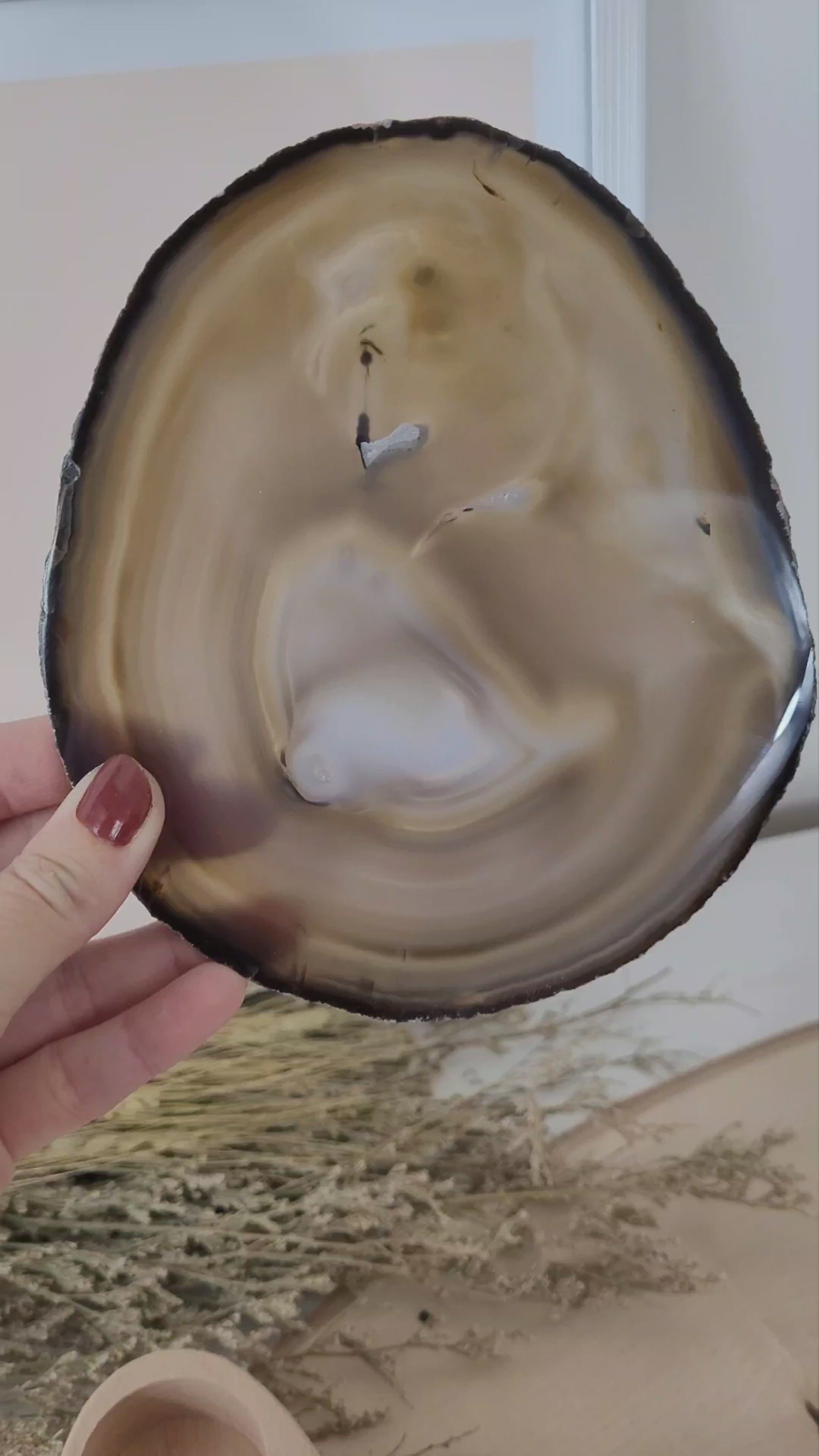 1x Achat Scheibe 15,1x12,8cm, 201g, inklusive Holzaufsteller mit Teelichthalter, Lieferung ohne Teelicht, diese wunderschöne Achat Scheibe fasziniert mit ihren Naturfarben, ihrer Bänderung, ihren inneren Kristalldrusen und wilden Mustern. Die flach geschliffene Achat Scheibe strahlt mit einem Teelicht durchleuchtet in ihrer vollsten Pracht aber kann natürlich auch liegend kraftvoll platziert werden.