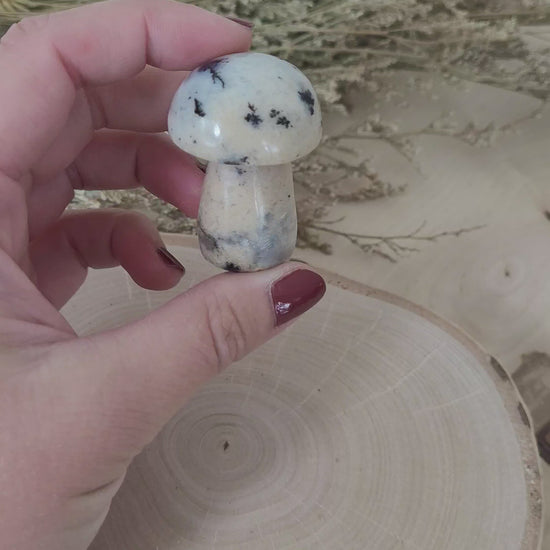 Der Dendriten Opal MIni Pilz hat eine Größe von 4,3x2,9cm. Es handelt sich genau um den Dendriten Opal Pilz, der auf den Bildern zu sehen ist, mit reichlich Dendriten Bildung.