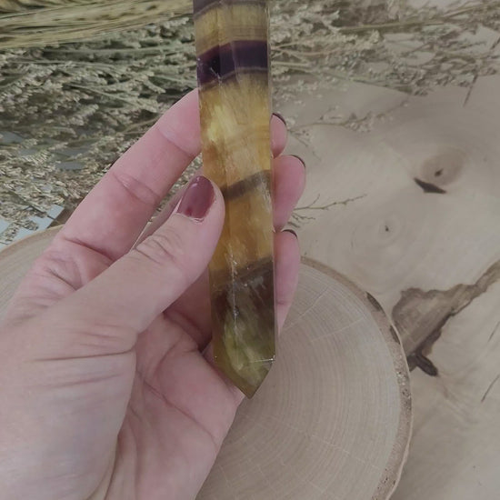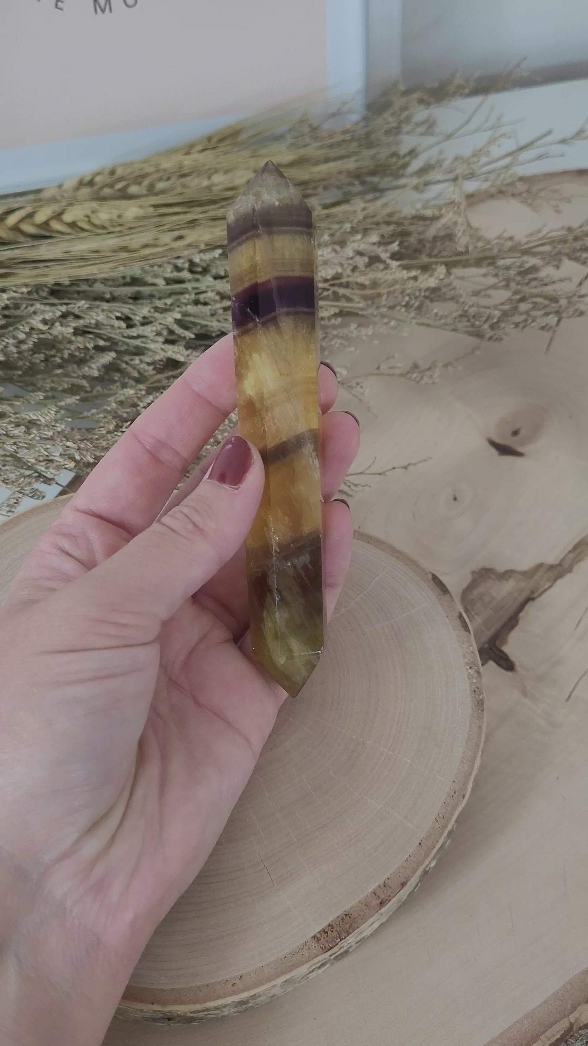 Der Fluorit Doppelender hat eine Größe von 12,6 x 1,9 cm und wiegt 110g. Es handelt sich genau um den Fluorit Doppelender, der auf den Bildern zu sehen ist.