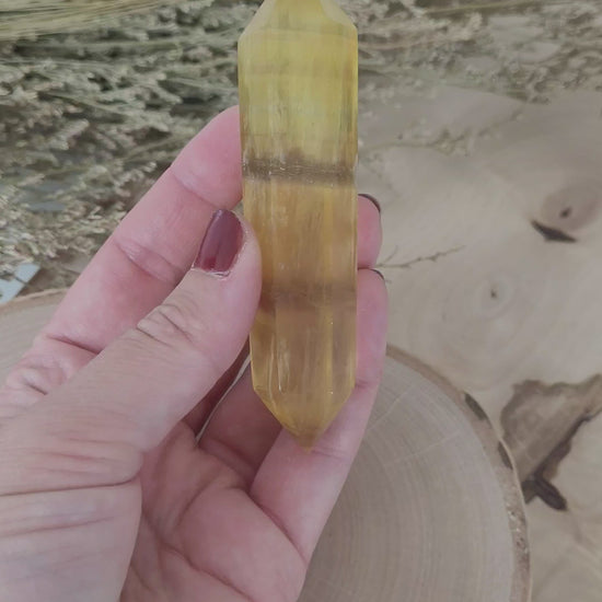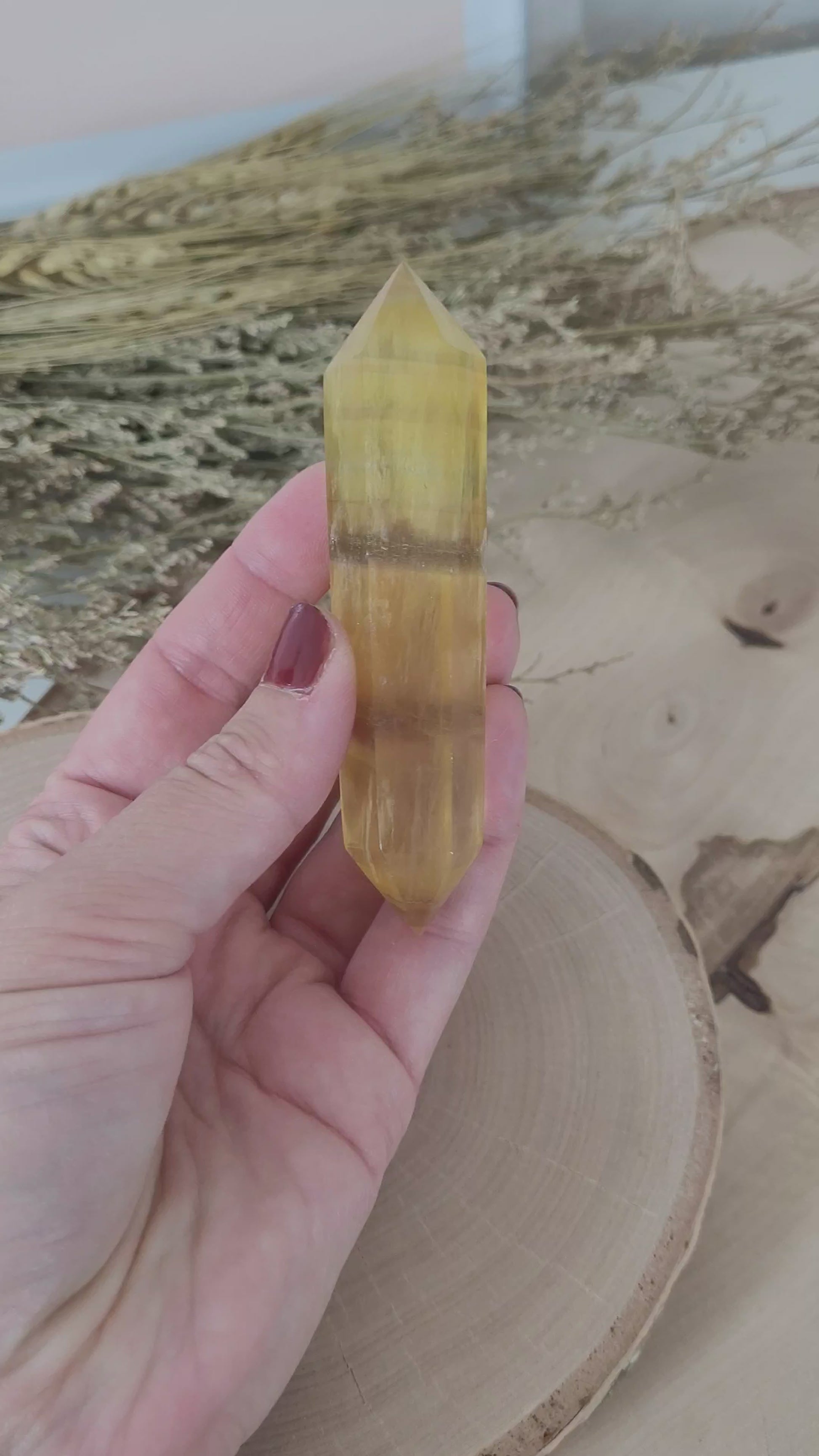 Der Fluorit Doppelender hat eine Größe von 9,1 x 2,1 cm und wiegt 74g. Es handelt sich genau um den Fluorit Doppelender, der auf den Bildern zu sehen ist.