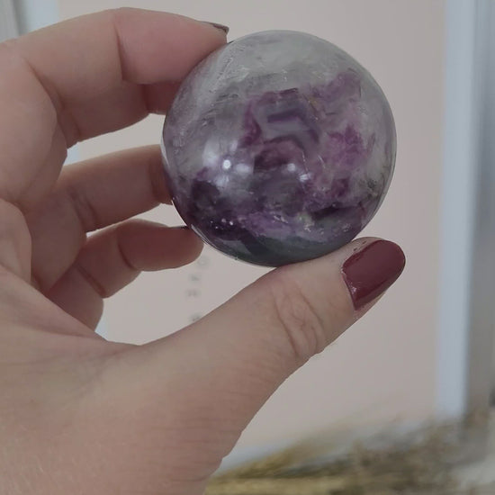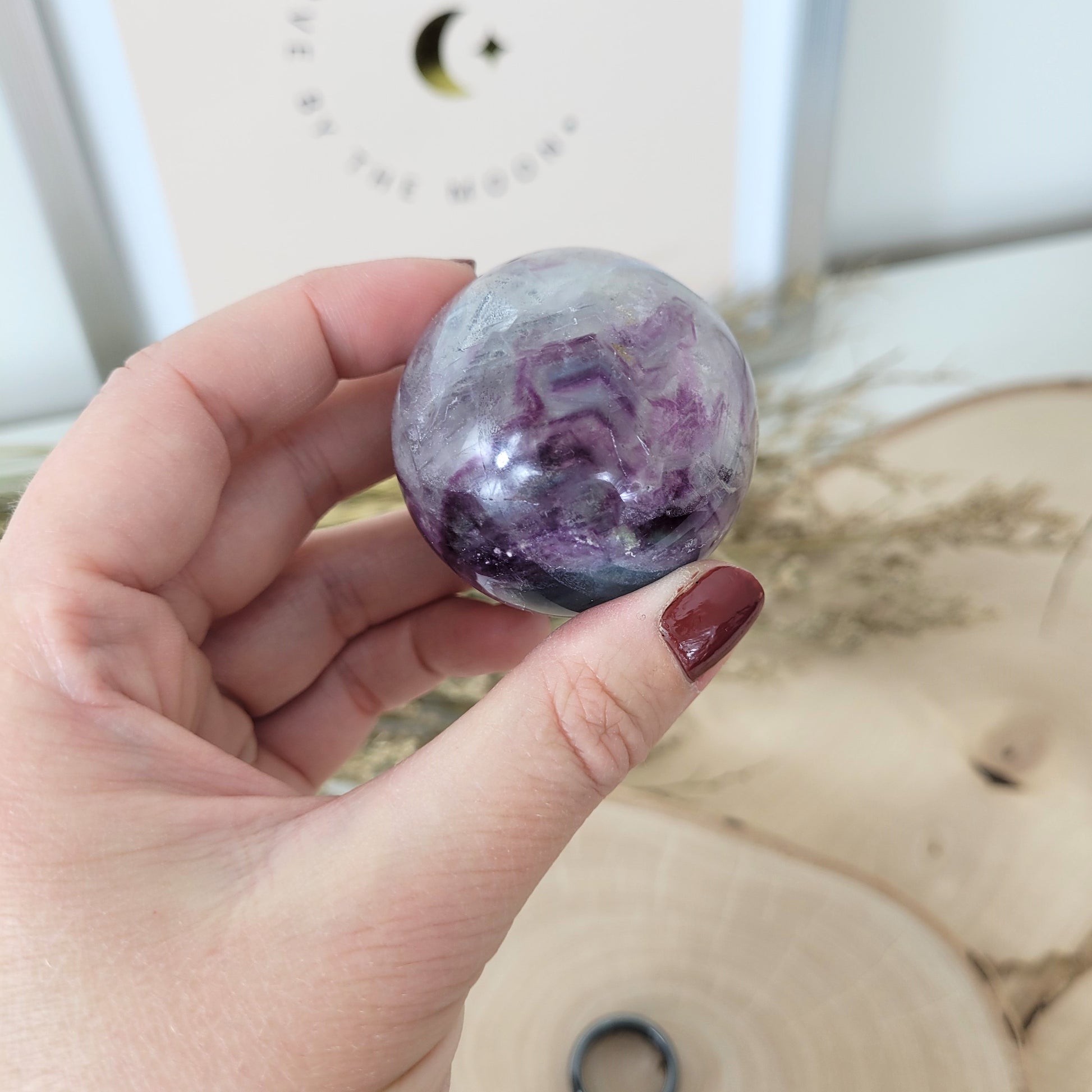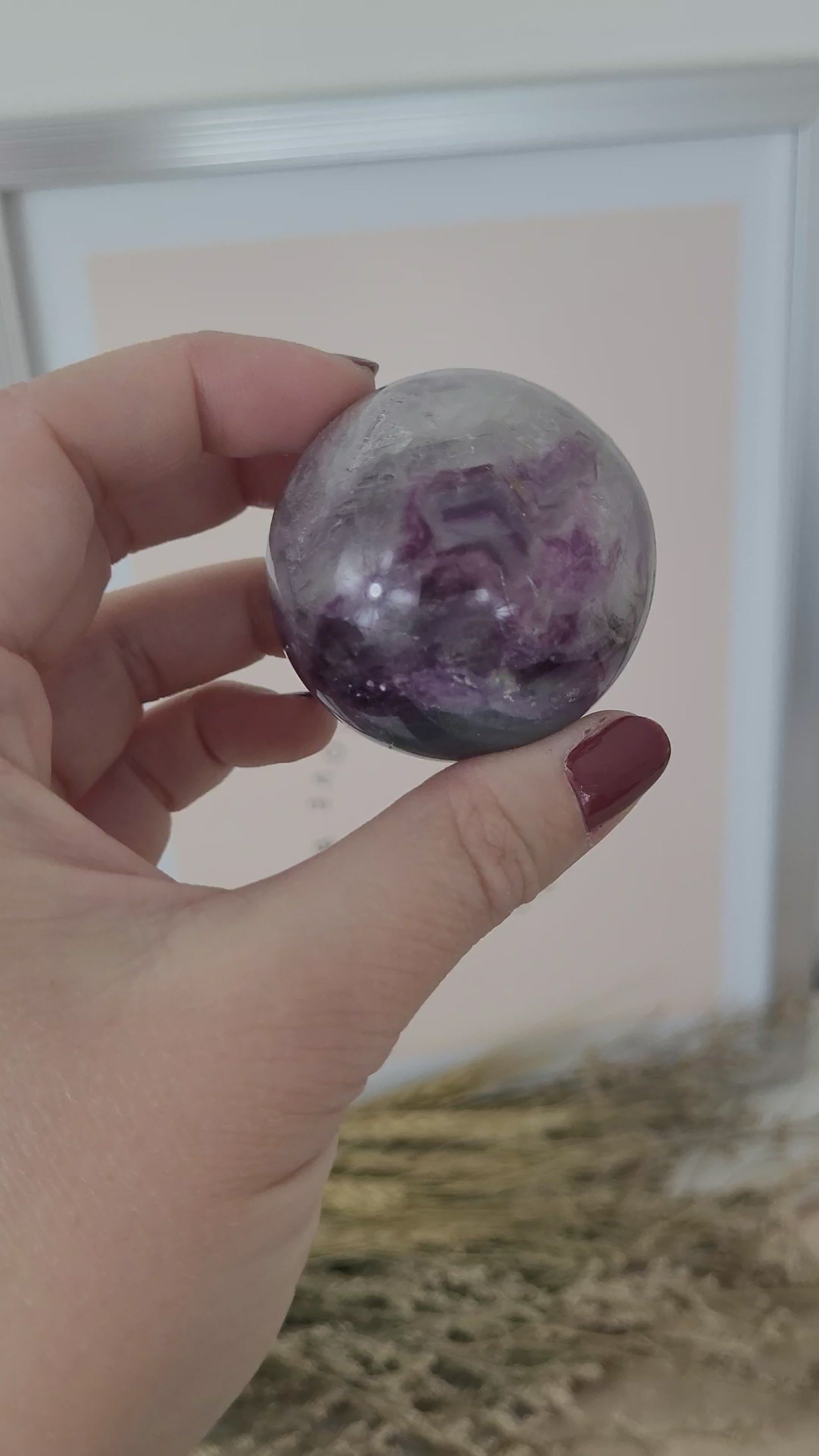 Diese Fluorit Kugel hat einen Durchmesser von 4,3 cm und ein Gewicht von 145g. Es handelt sich genau um die Fluorit Kugel, die auf den Bildern zu sehen ist.