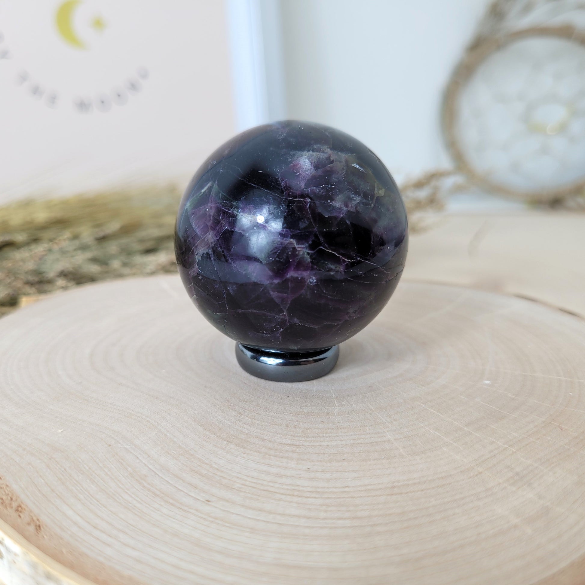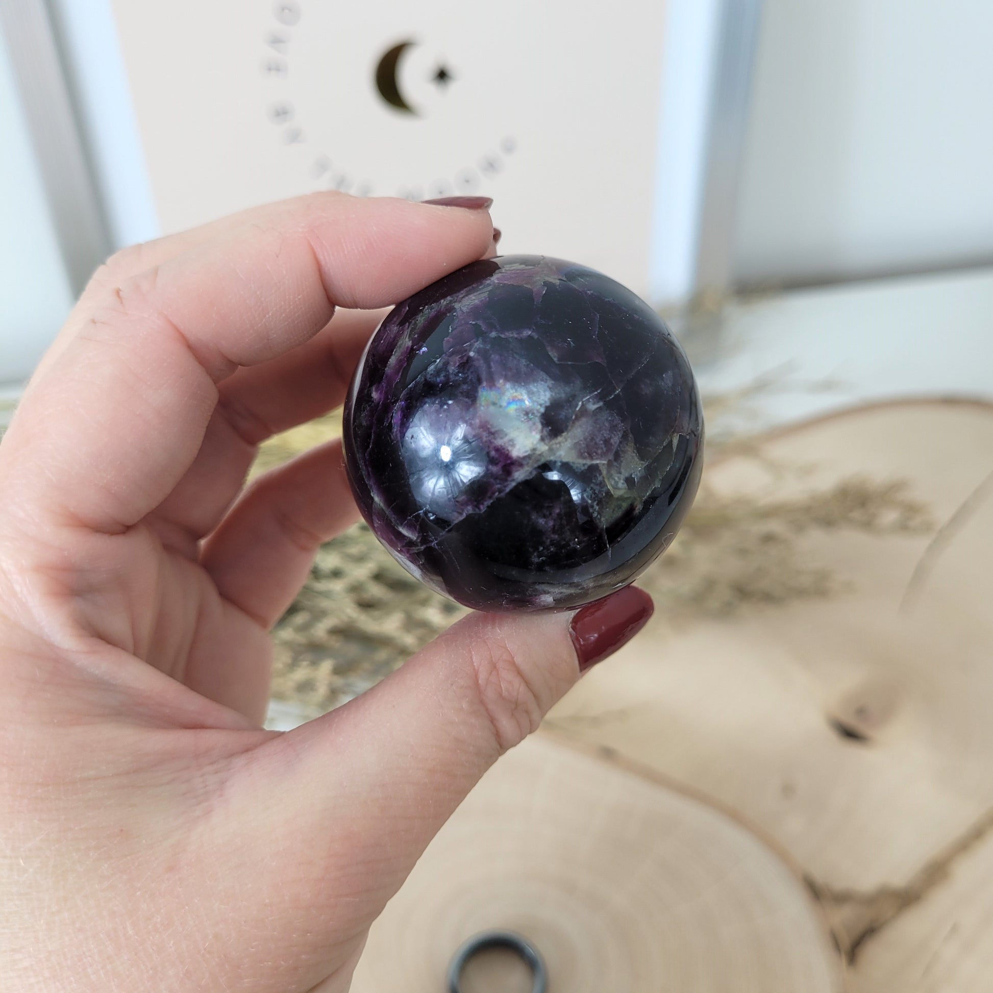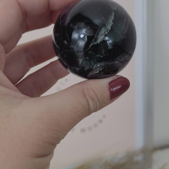 Diese Fluorit Kugel verzaubert mit ihrem so intensiv dunklem lila Farbton, dass dieser fast schon schwarz erscheint auf den ersten Blick. Sobald diese Kugel im Tageslicht angeschaut wird oder auch wie auf dem Video direkt angeleuchtet wird, offenbart sie ihr unglaublich schönes und magisches Kristallleben mit viel Glitzer und Regenbögen bei Lichtbrechung.