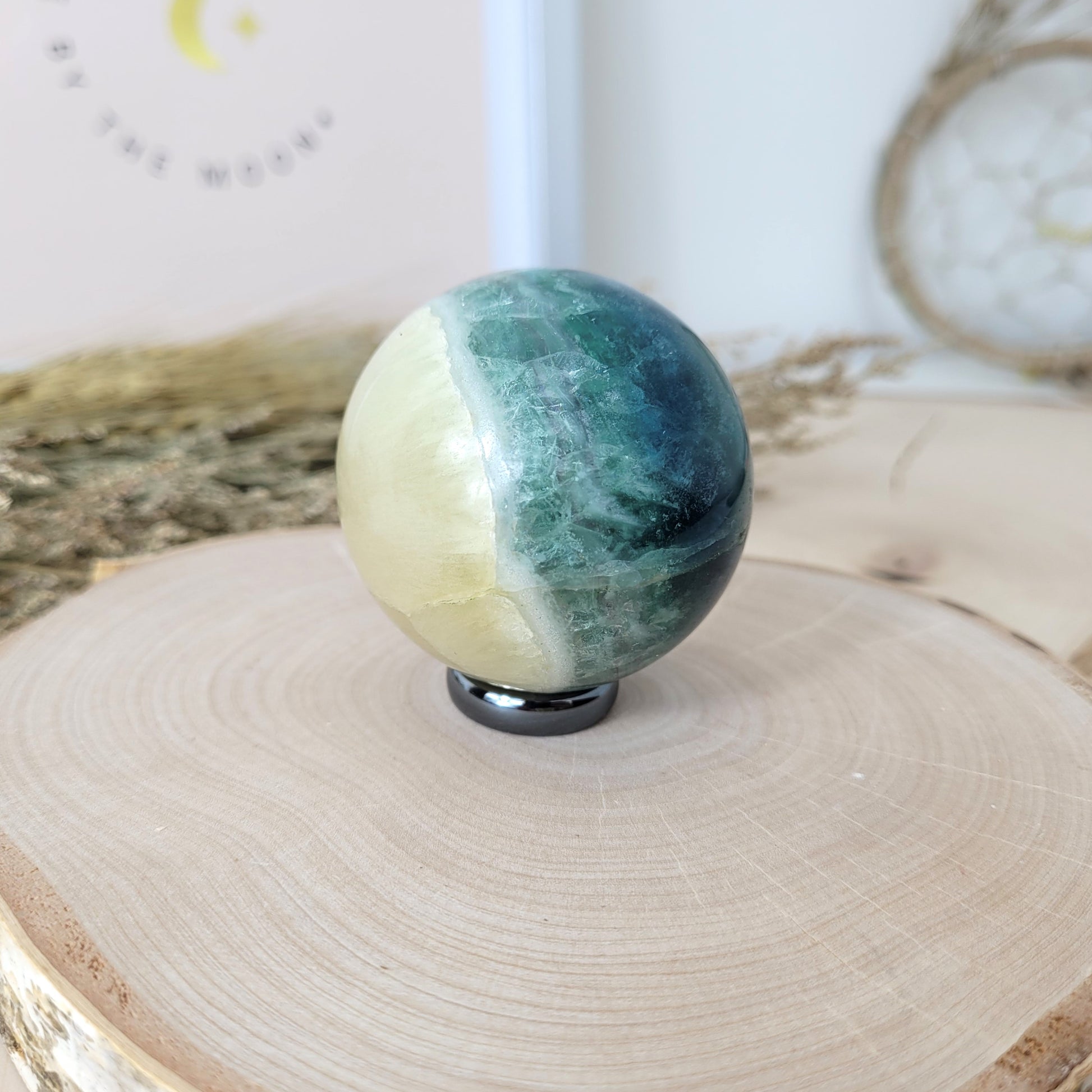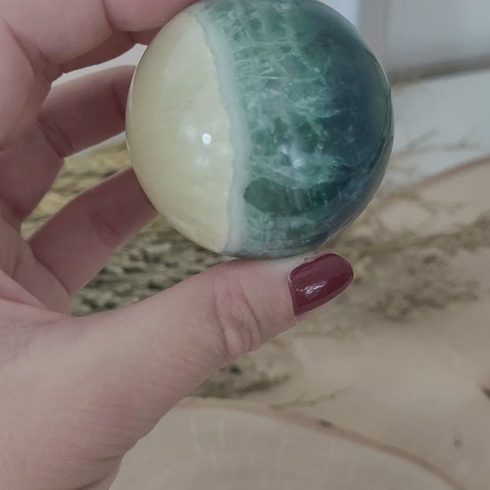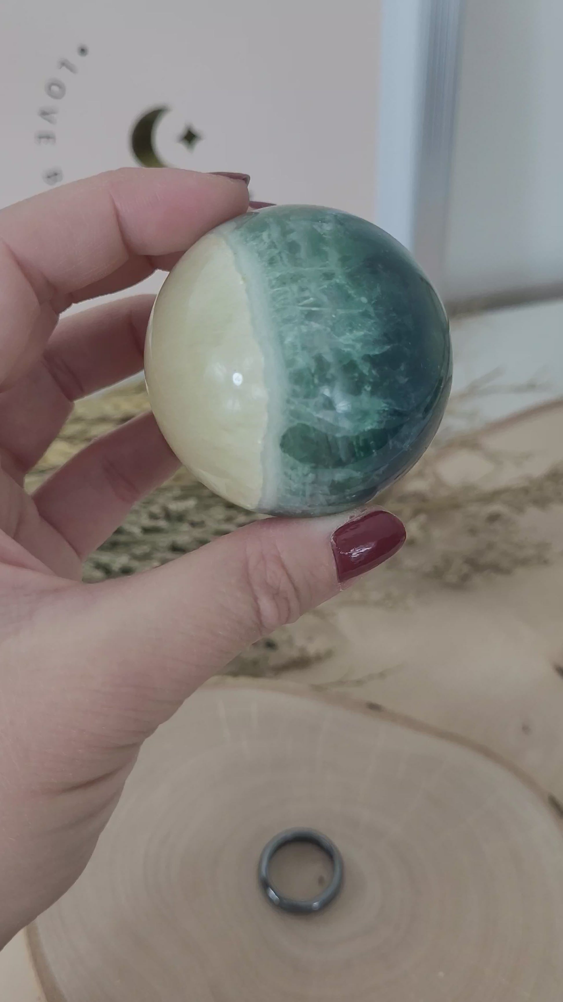 Diese Fluorit Kugel bezaubert mit kleinen Regenbögen bei Lichteinfall in ihrem Kristallinneren und lässt sich wunderbar durchleuchten in ihrem klaren Kristallinnenleben. Ihre einzigartige Optik mit dem Zusammenspiel aus blass gelben Fluorit und zur anderen Hälfte aus leuchtend grünem Fluorit, macht diese Kugel schon sehr einzigartig.