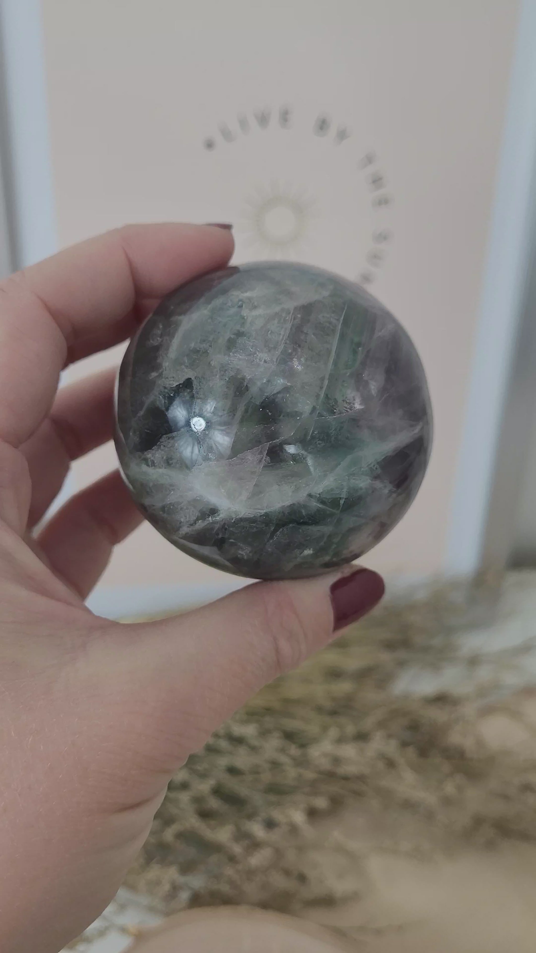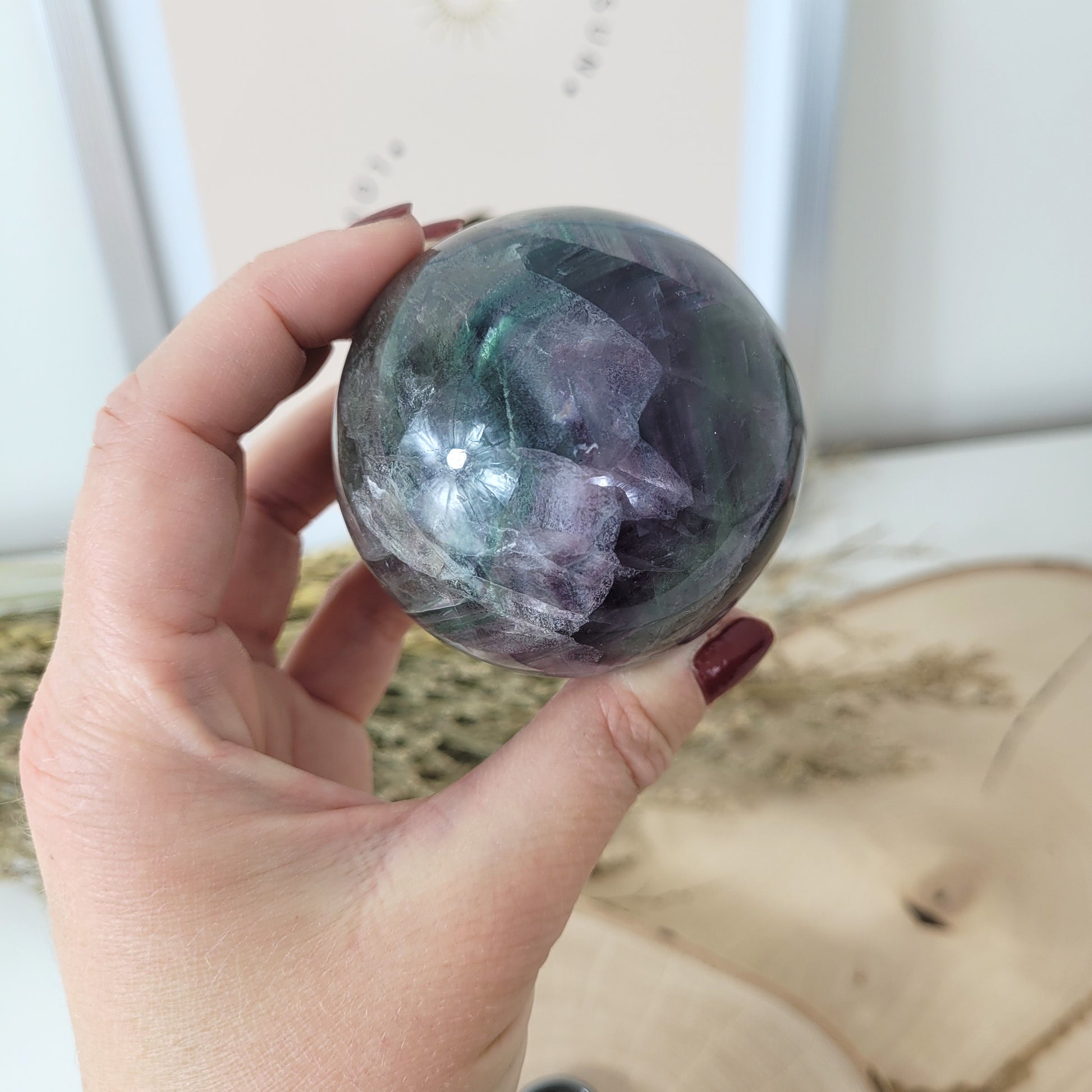 Diese Fluorit Kugel hat einen Durchmesser von 5,9 cm und ein Gewicht von 374g. Es handelt sich genau um die Fluorit Kugel, die auf den Bildern zu sehen ist.
