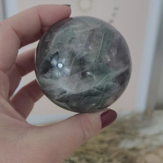 Was auf dem Video kaum einzufangen war, diese Fluorit Kugel bezaubert mit zahlreichen Regenbögen bei Lichteinfall in ihrem Kristallinneren und faszinierenden Phantomspitze, die bei genauerem Hinschauen sich offenbaren. Daher als Tipp: diese Kugel unbedingt im Tageslicht oder im direkten Lichteinfall anschauen und verzaubern lassen von ihrer ganz besonderen Einzigartigkeit.