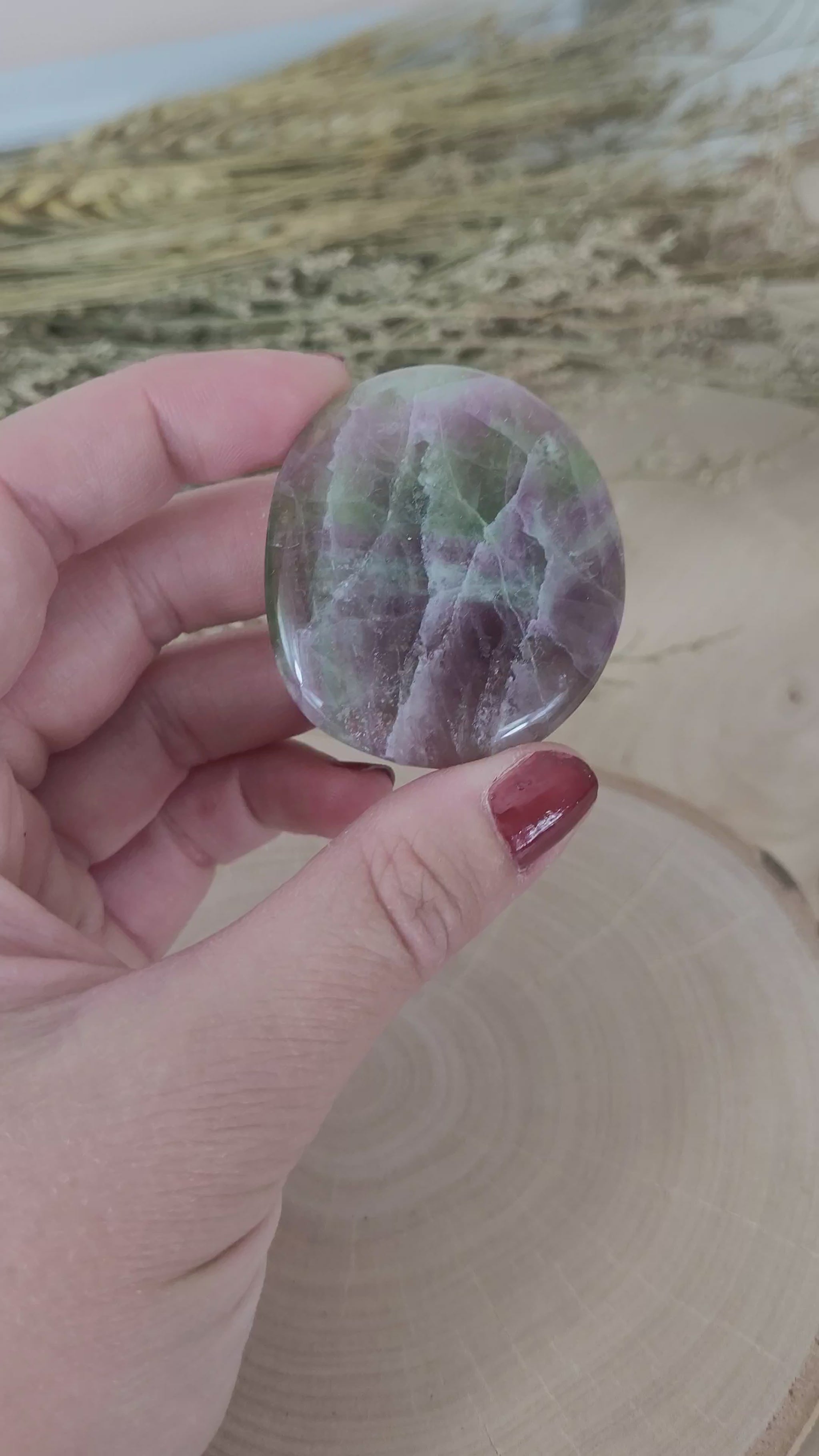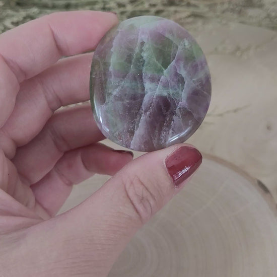 Dieser wunderschöne, flache Fluorit Scheibenstein fasziniert mit seinem intensiven Naturfarbenspiel und seinem strukturreichen Innenleben der Kristallstruktur.