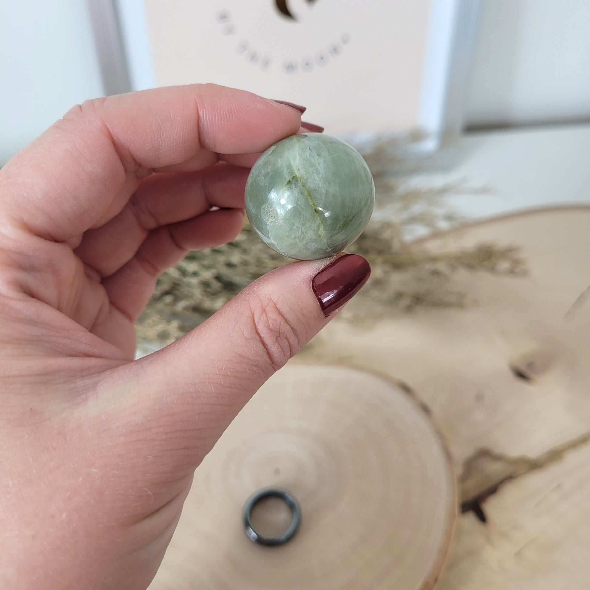 Diese grüne Mondstein Kugel hat einen Durchmesser von 2,6cm und wiegt 28g. Es handelt sich genau um die Kugel, die auf den Bildern zu sehen ist.