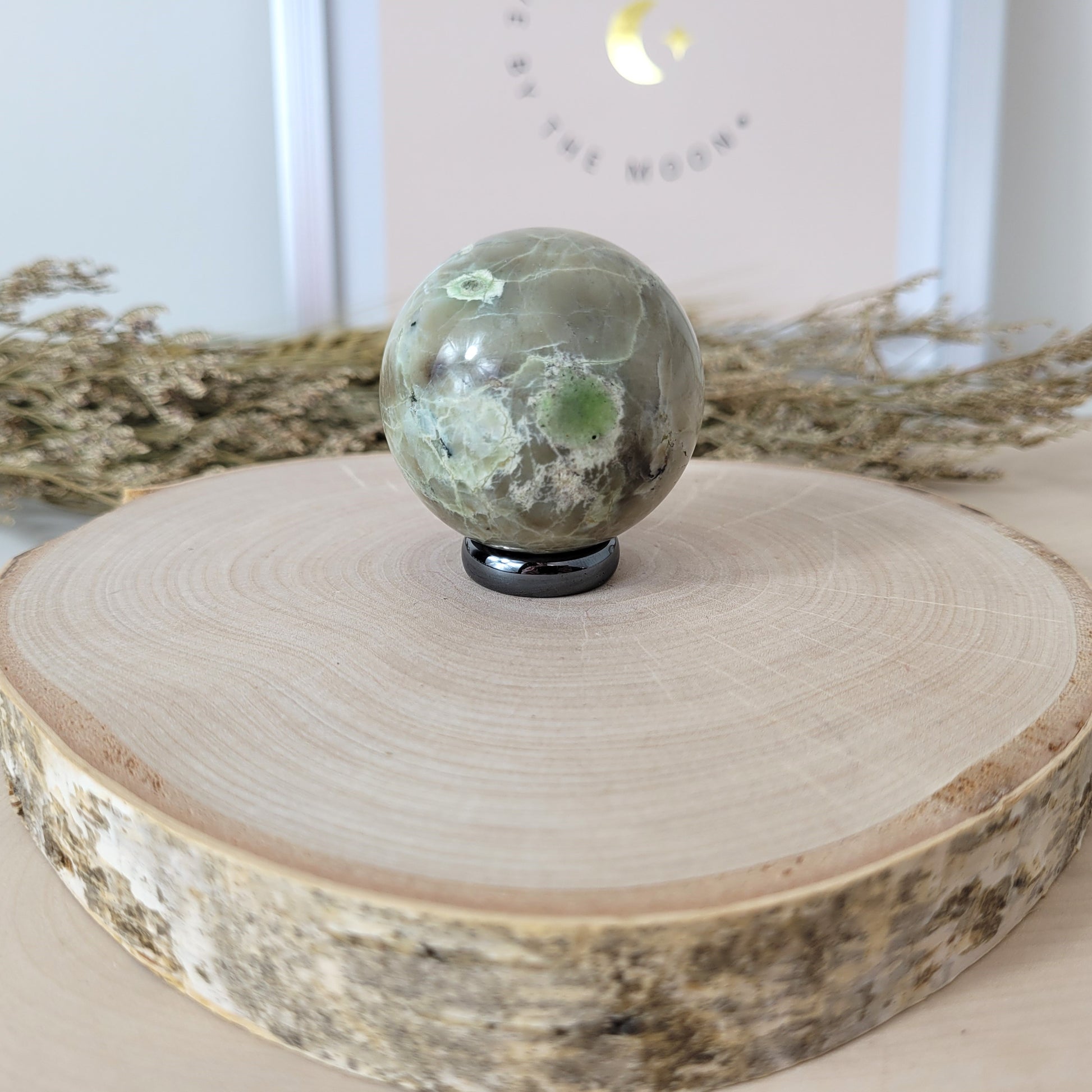 Diese wunderschöne Kugel grüner Mondstein, auch Garnierit genannt, fasziniert mit ihrer intensiven, besonderen Naturfarbe und ihren strukturreichen Mustern in den Farbverläufen. Der grüne Mondstein hat meist keinen bis sehr wenig Flash oder ein leichten silbrigen Schimmer, aber fasziniert mit ihren wilden Mustern und Strukturen genauso zauberhaft.