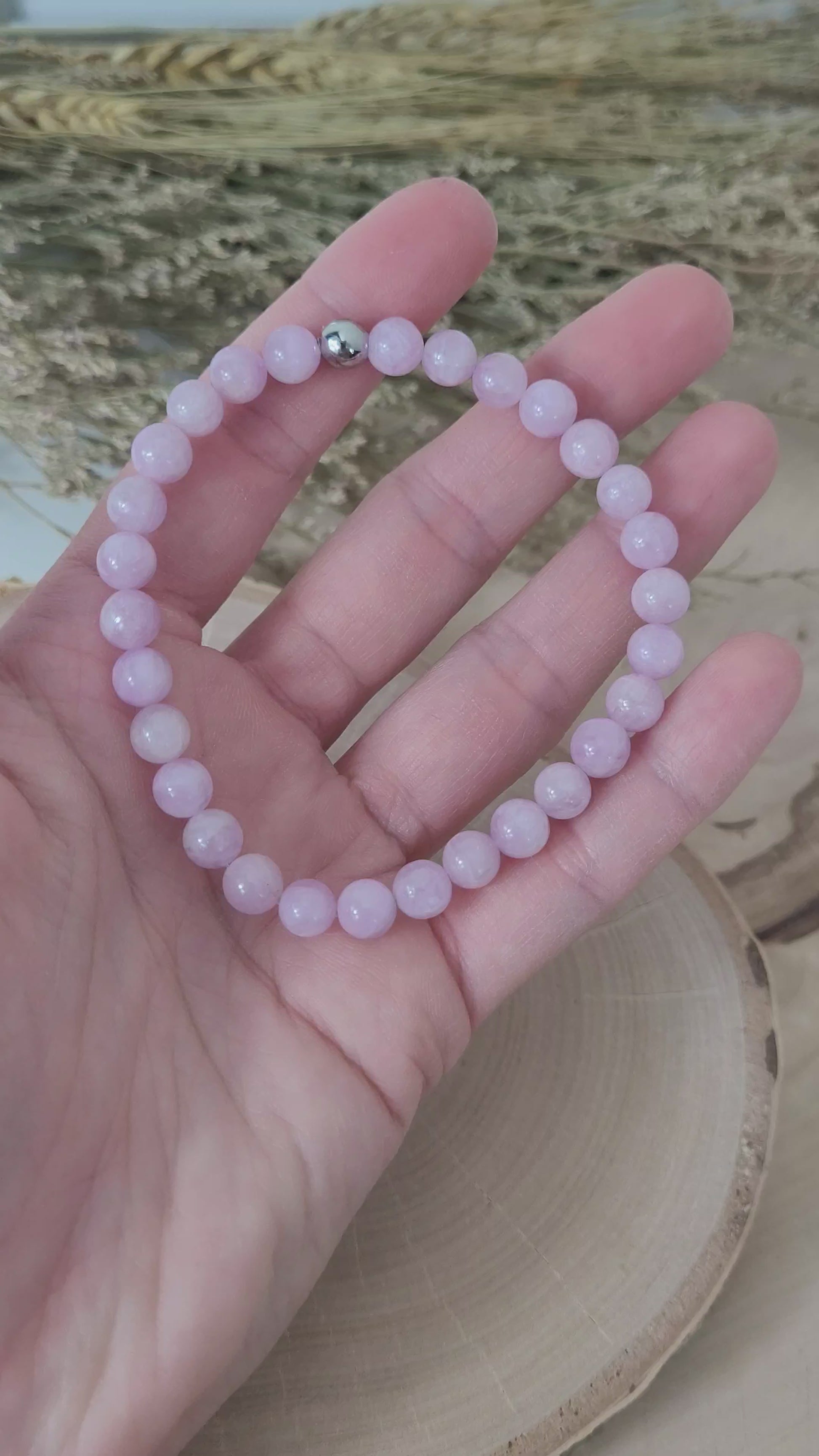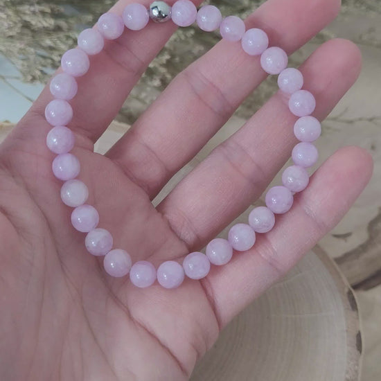 Elastisches Armband aus 6 mm Kunzit Perlen und einer Endperle (zum eleganten Kaschieren des Endknotens) aus hochwertigem Edelstahl (rostfrei, wasserfest). Armbandlänge ca. 19 cm.