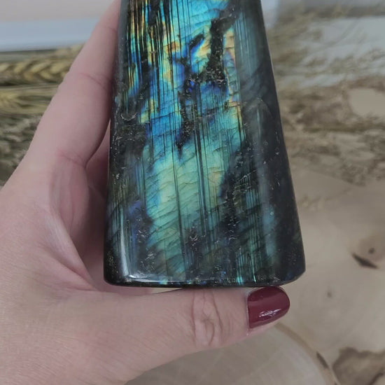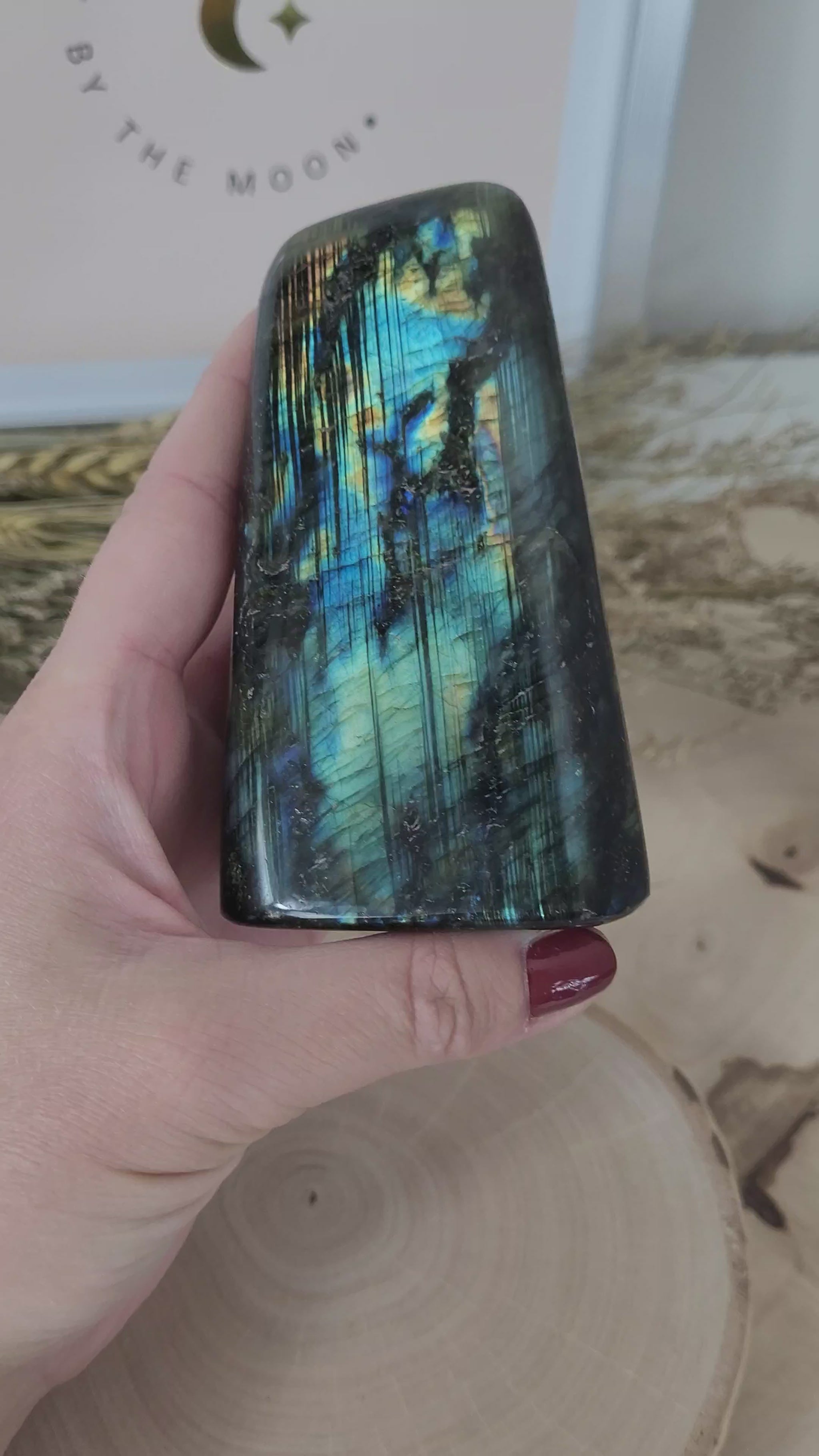 Die Labradorit Freiform hat eine Größe von 10,3 x 5,4 cm und wiegt 434g. Es handelt sich genau um die Labradorit Freiform, die auf den Bildern zu sehen ist.