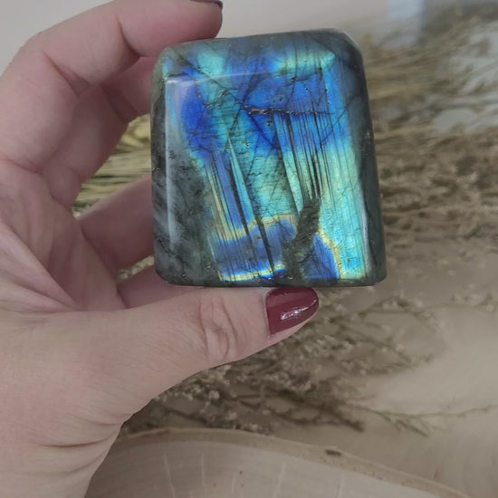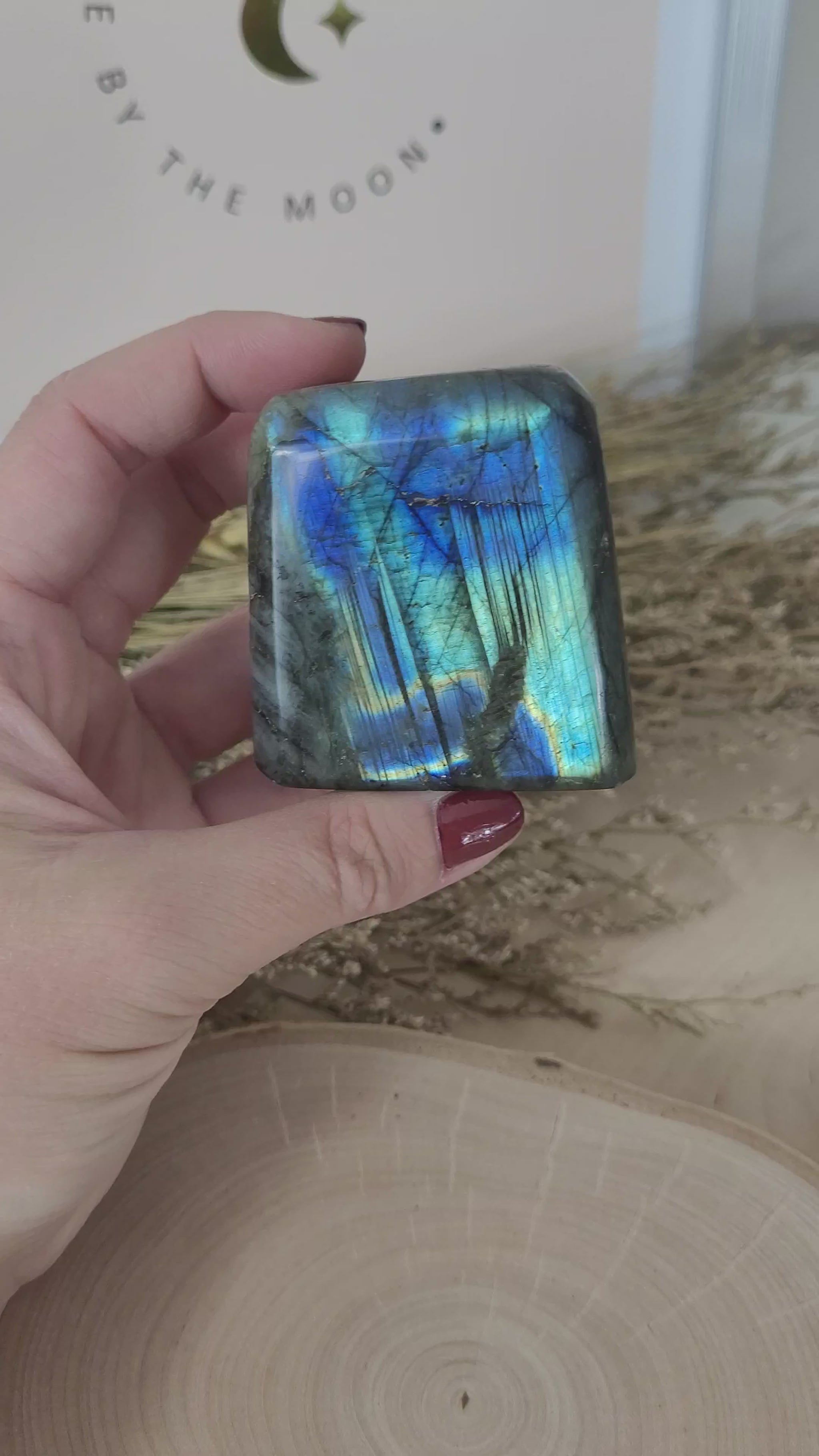 Die Labradorit Freiform hat eine Größe von 5,6 x 4,9 cm und wiegt 188g. Es handelt sich genau um die Labradorit Freiform, die auf den Bildern zu sehen ist.