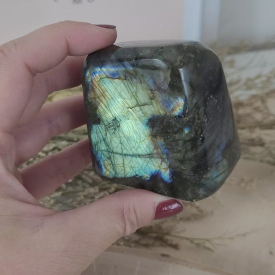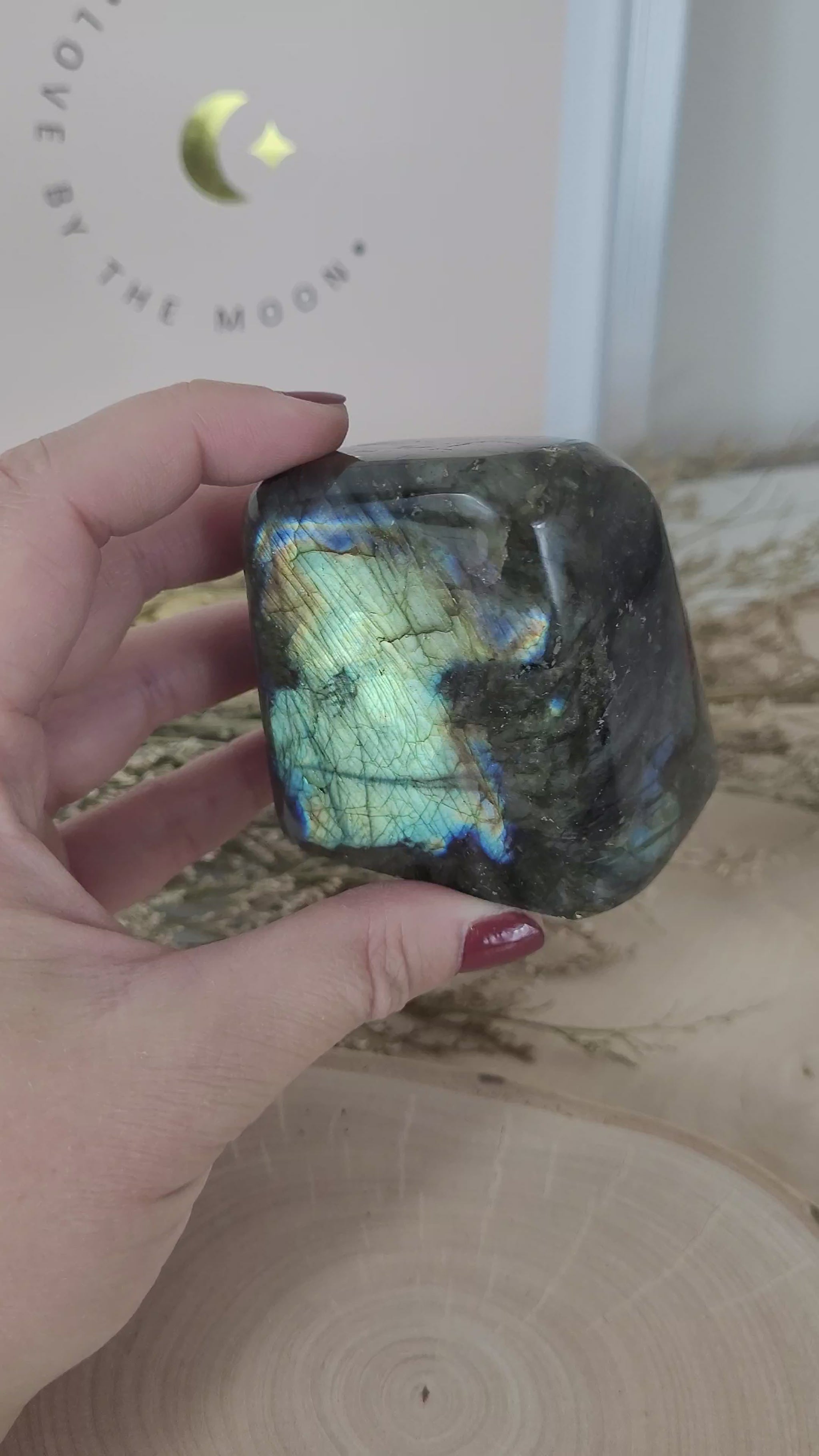 Die Labradorit Freiform hat eine Größe von 6,1 x 5,8 cm und wiegt 279g. Es handelt sich genau um die Labradorit Freiform, die auf den Bildern zu sehen ist.