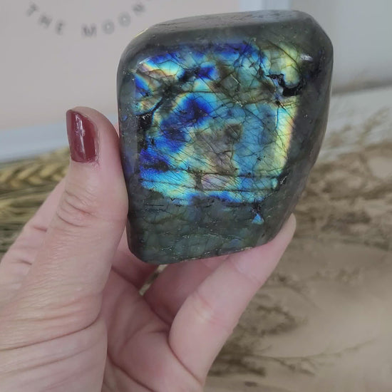 Die Labradorit Freiform hat eine Größe von 6,3 x 5 cm und wiegt 226g. Es handelt sich genau um die Labradorit Freiform, die auf den Bildern zu sehen ist.